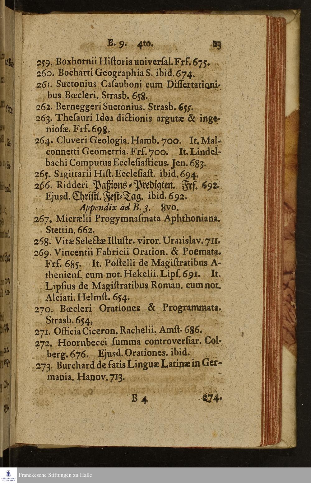 Catalogvs Bibliothecæ Clarissimi Viri Godofredi Kravlii, Collegae Tertii De Gymnasio Hallensi Optime Meriti : Qvæ Continet Selectissimos Libros Theologicos, Historicos, Philosoph. Philolog. Poet. Cet. D. VII. Maii Et Svbseqventibvs MDCCXXXVI. Hallæ In Ædibvs Rvdloffianis (in der Fleischer-Gasse) Hor. Antem. X-XII. Et Pom. II.-IV. Legibvs Avctionibvs Consvetis Plvs Licitantibvs Et Nvmeratam Pecvniam Solventibvs Divendendos.