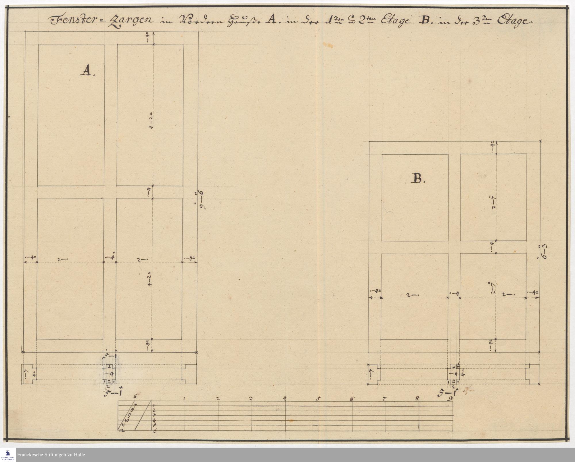 Aufriss der Fensterrahmen an der Vorderseite des Historischen Waisenhauses.