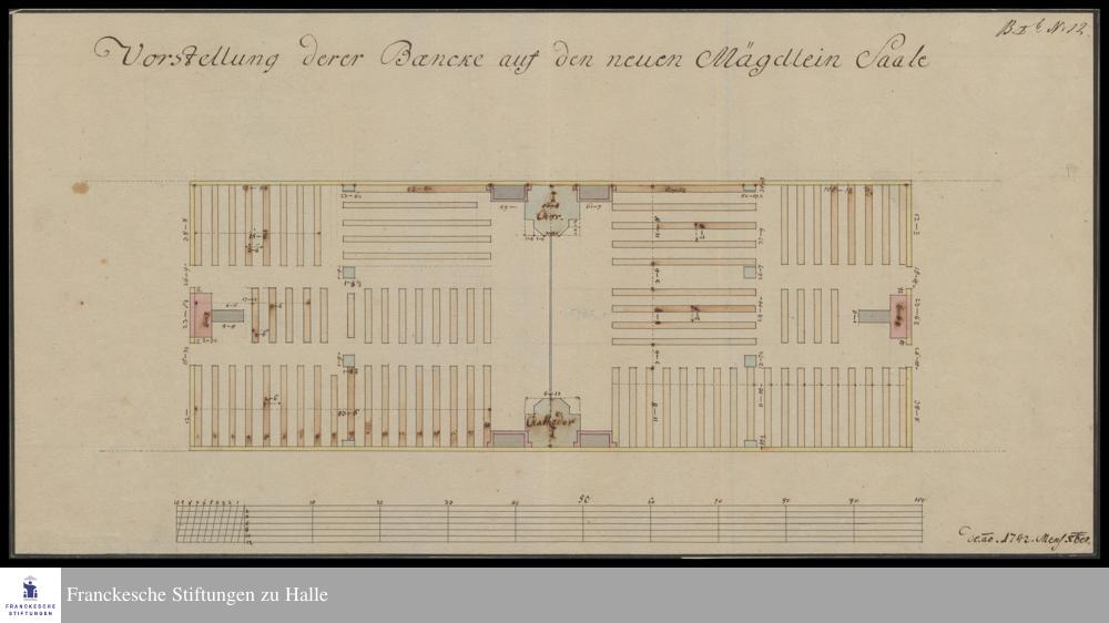 Grundriss und Bestuhlung des Saales im zweiten Obergeschoss vom Neuen Mägdeleinhaus.