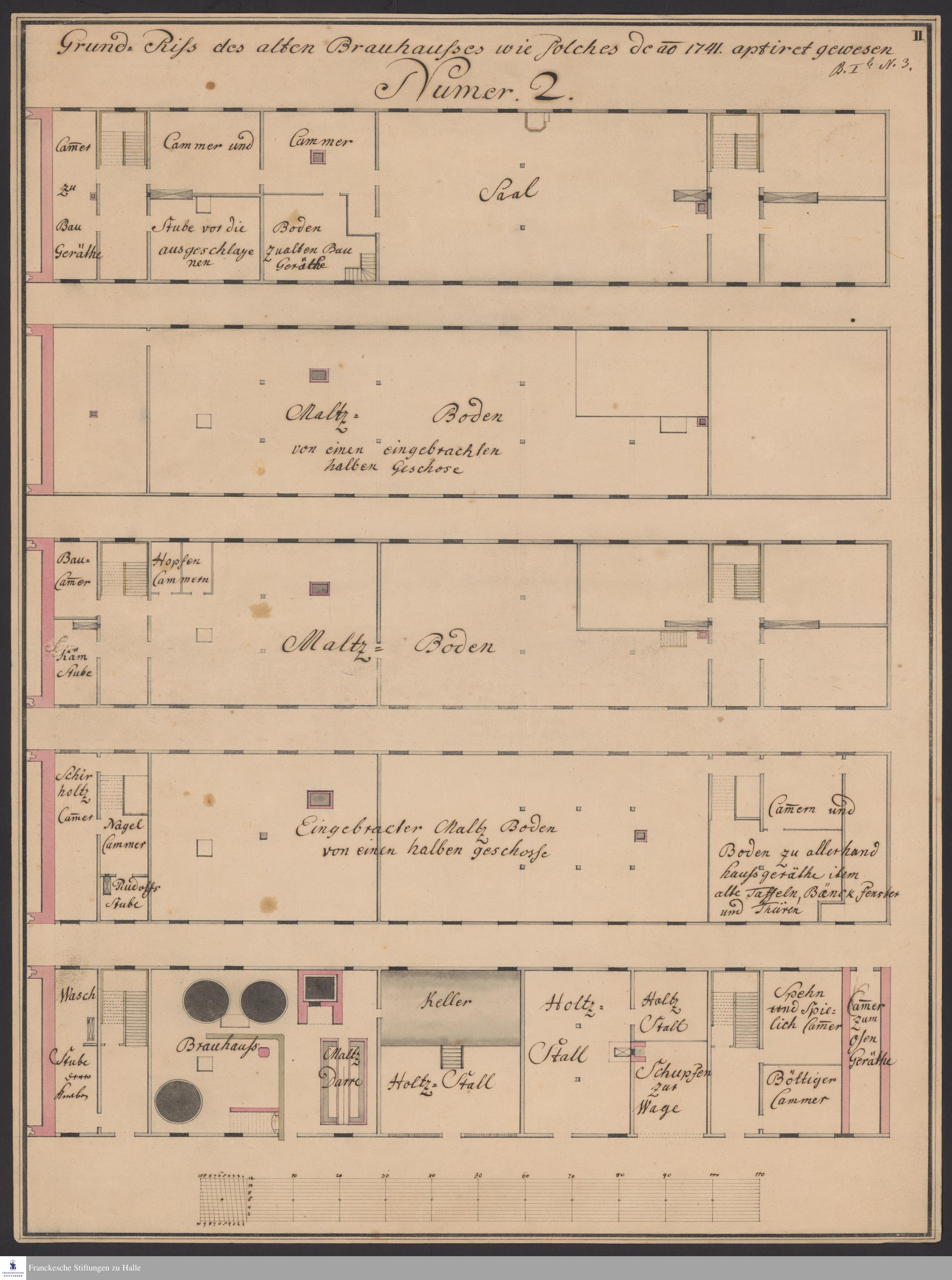 Grundriss vom Erdgeschoss, ersten und zweiten Obergeschoss mit einigen Zwischenböden des Neuen Mägdeleinhauses.