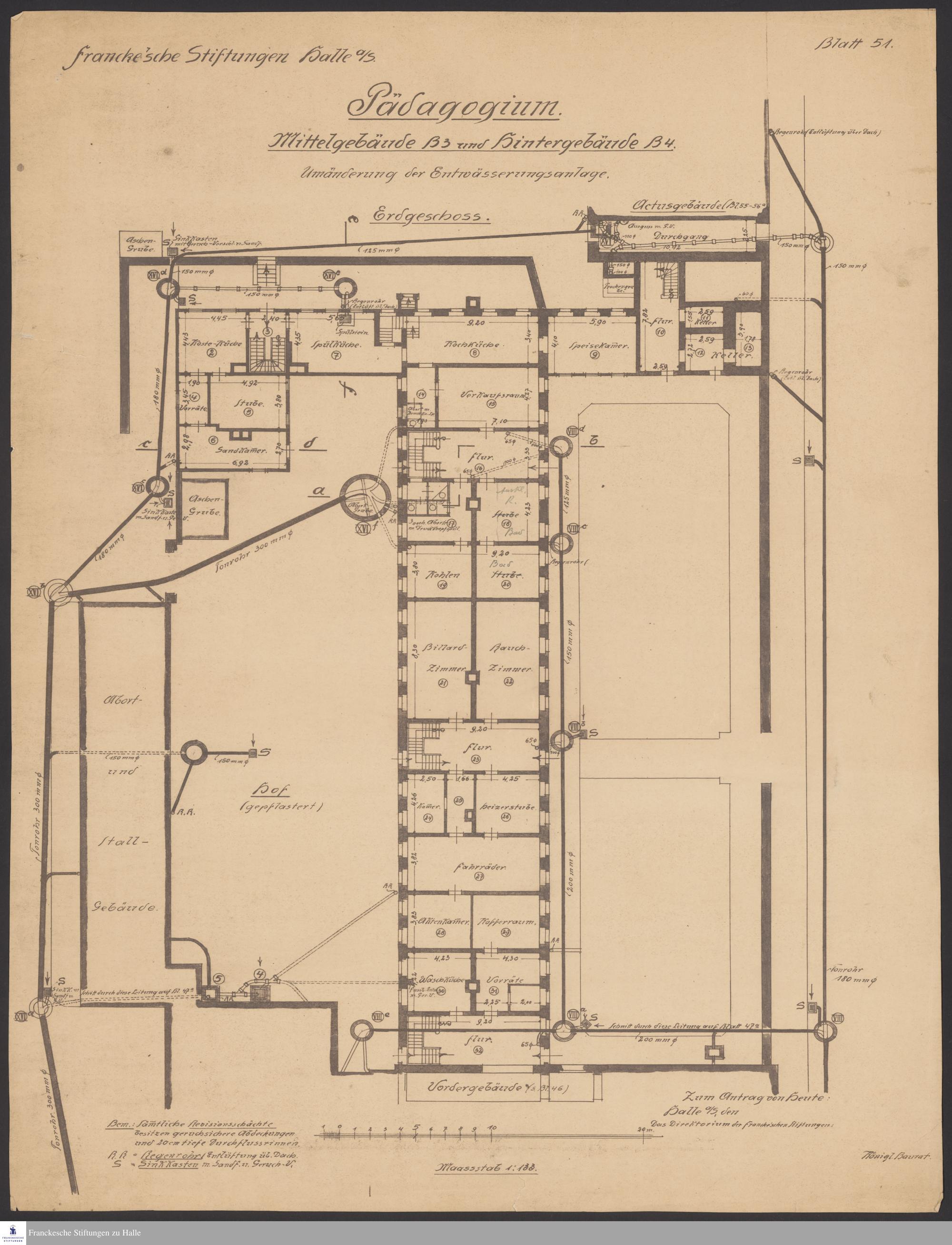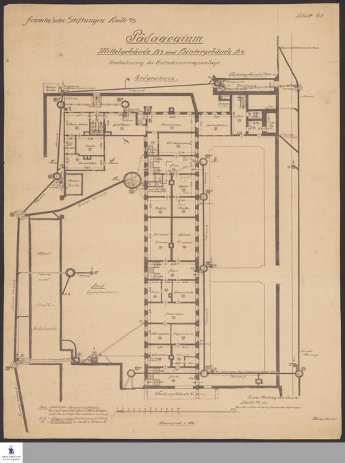 Grundriss vom Erdgeschoss des Mittel- und Hintergebäudes des Pädagogiums mit Abort- und Entwässerungsanlage sowie vom Abort- und Stallgebäude mit Raumbezeichnung.