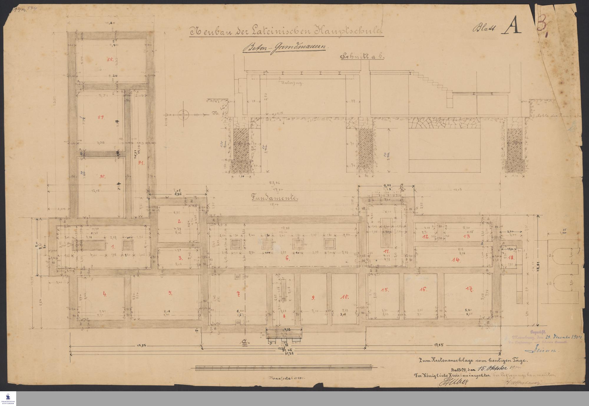 Grundriss und Querschnitt vom Fundament der Lateinischen Hauptschule.