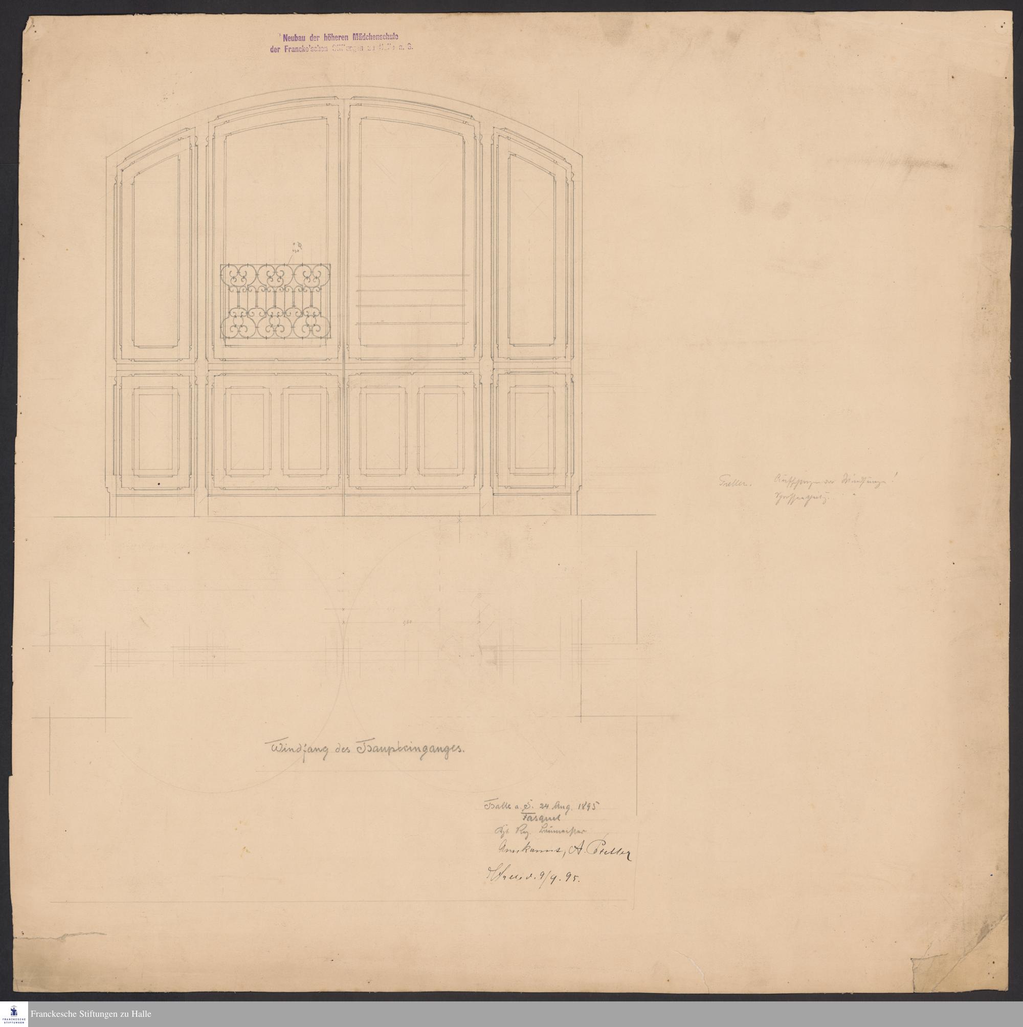 Aufriss und Grundriss vom Windfang des Haupteingangs der Höheren Mädchenschule.