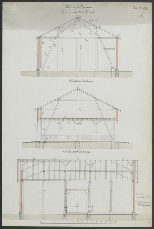 Querschnitte und Längsschnitt vom Gesamtgebäude einer Scheune auf dem Rittergut Kanena.