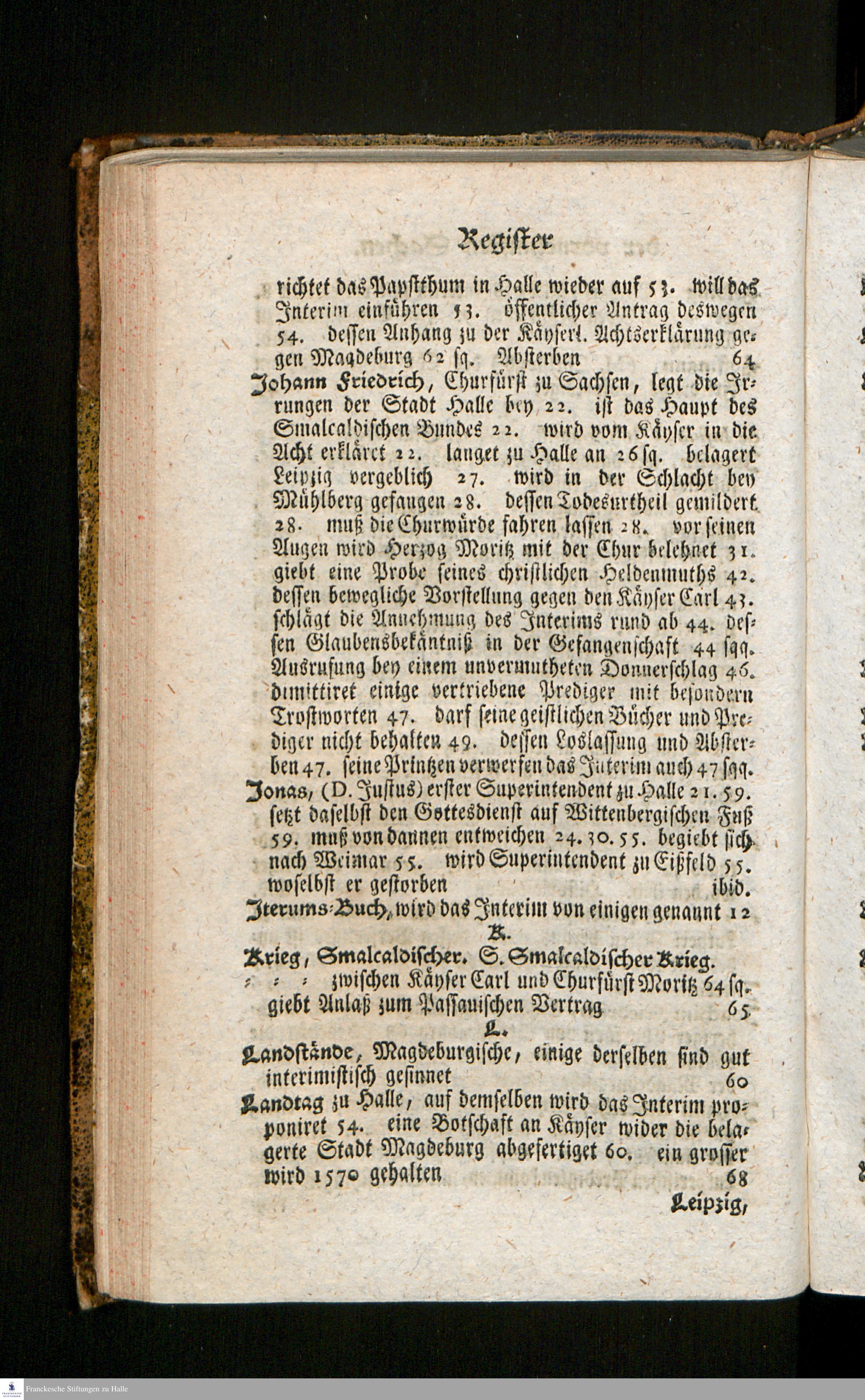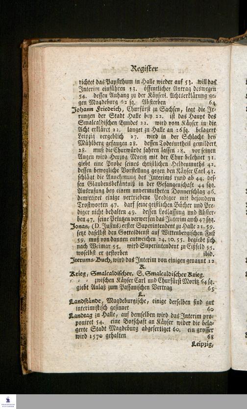 Kurtzgefaßte Nachricht von den wegen des Interims vor zweyhundert Jahren so wol in der Stadt Halle, als auch sonst noch vorgefallenen Merckwürdigsten Begebenheiten : zum erneuerten Andencken der damals gar sonderlich über waltenden Güte Gottes, aus verschiedenen dahin gehörigen Schriften der Kirchen- und politischen Geschichte mitgetheilet / von Johann George Kirchnern, Adjuncto Ministerii und Predigern bey der Kirche zur L. Frauen.