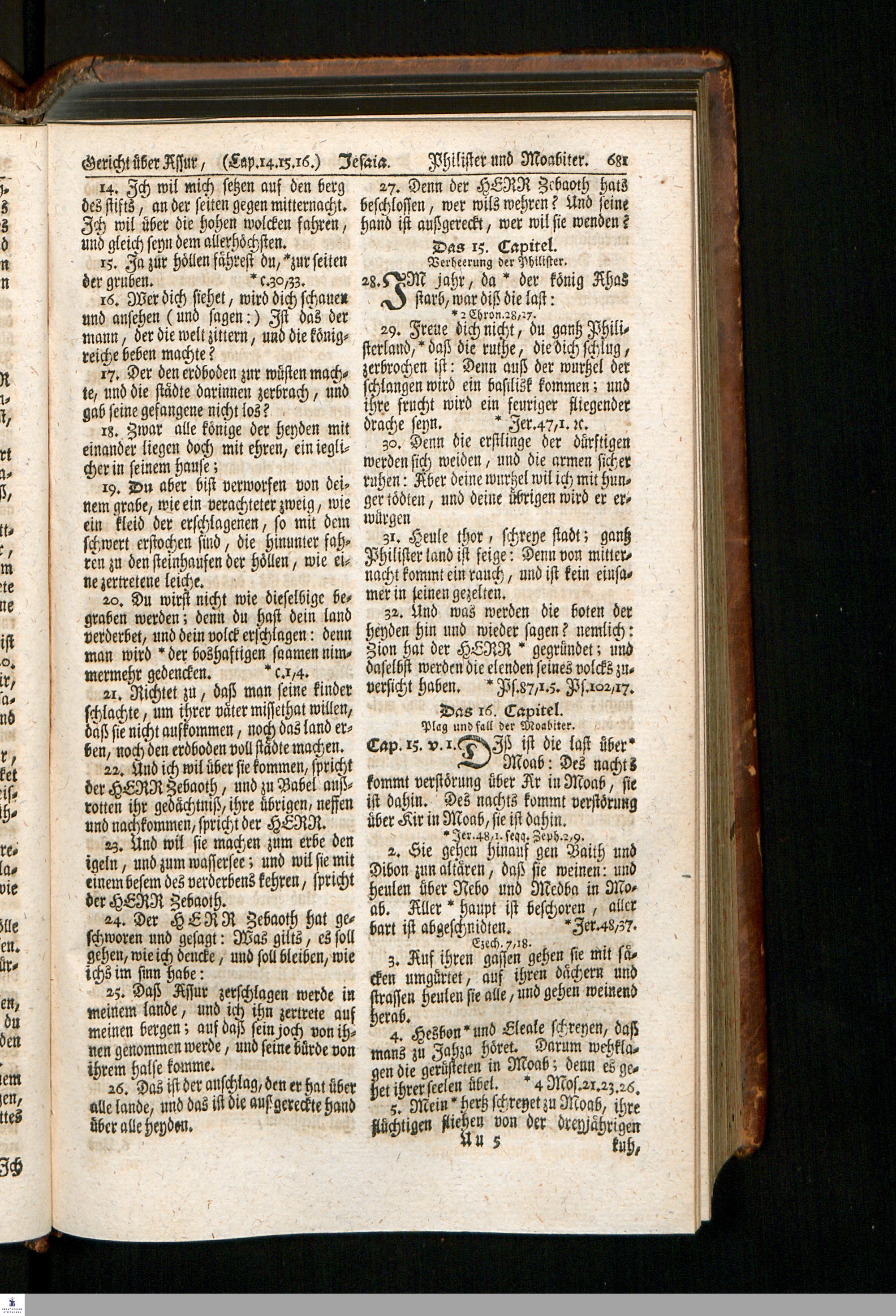 Biblia, Das ist: Die gantze Heil. Schrift Altes und Neues Testaments / Nach der Teutschen Ubersetzung D. Martin Luthers; Mit iedes Capitels kurtzen Summarien, auch beygefügten vielen und richtigen Parallelen; Mit fleiß übersehen/ und gegen einige/ sonderlich erstere/ Editiones des sel. Mannes gehalten, auch an unterschiedlichen Orten nach denselben eingerichtet, und von vielen in den bisherigen Exemplarien hin und wieder eingeschlichenen Fehlern gesaubert. Nebst einer Vorrede Herrn Baron Carl Hildebrands von Canstein