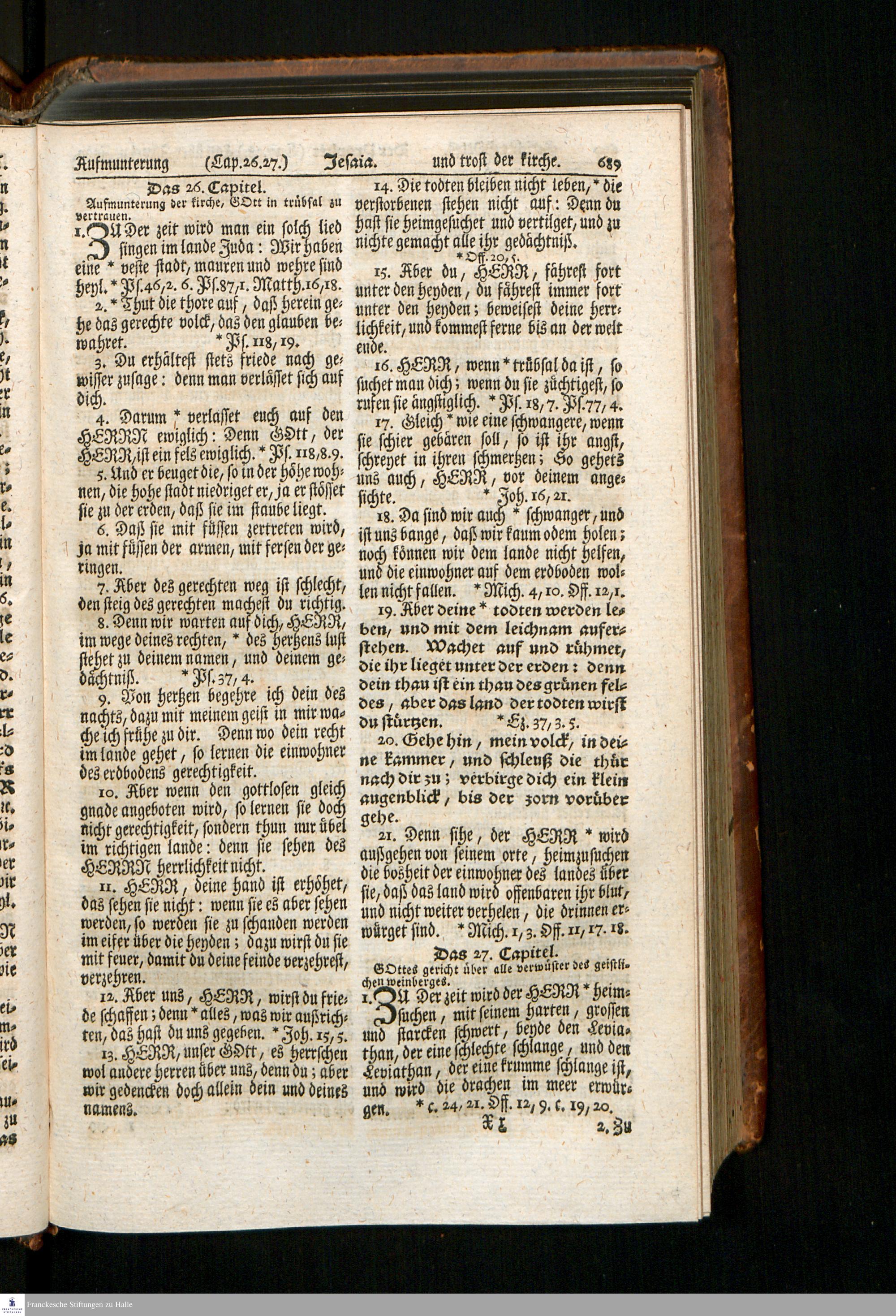 Biblia, Das ist: Die gantze Heil. Schrift Altes und Neues Testaments / Nach der Teutschen Ubersetzung D. Martin Luthers; Mit iedes Capitels kurtzen Summarien, auch beygefügten vielen und richtigen Parallelen; Mit fleiß übersehen/ und gegen einige/ sonderlich erstere/ Editiones des sel. Mannes gehalten, auch an unterschiedlichen Orten nach denselben eingerichtet, und von vielen in den bisherigen Exemplarien hin und wieder eingeschlichenen Fehlern gesaubert. Nebst einer Vorrede Herrn Baron Carl Hildebrands von Canstein