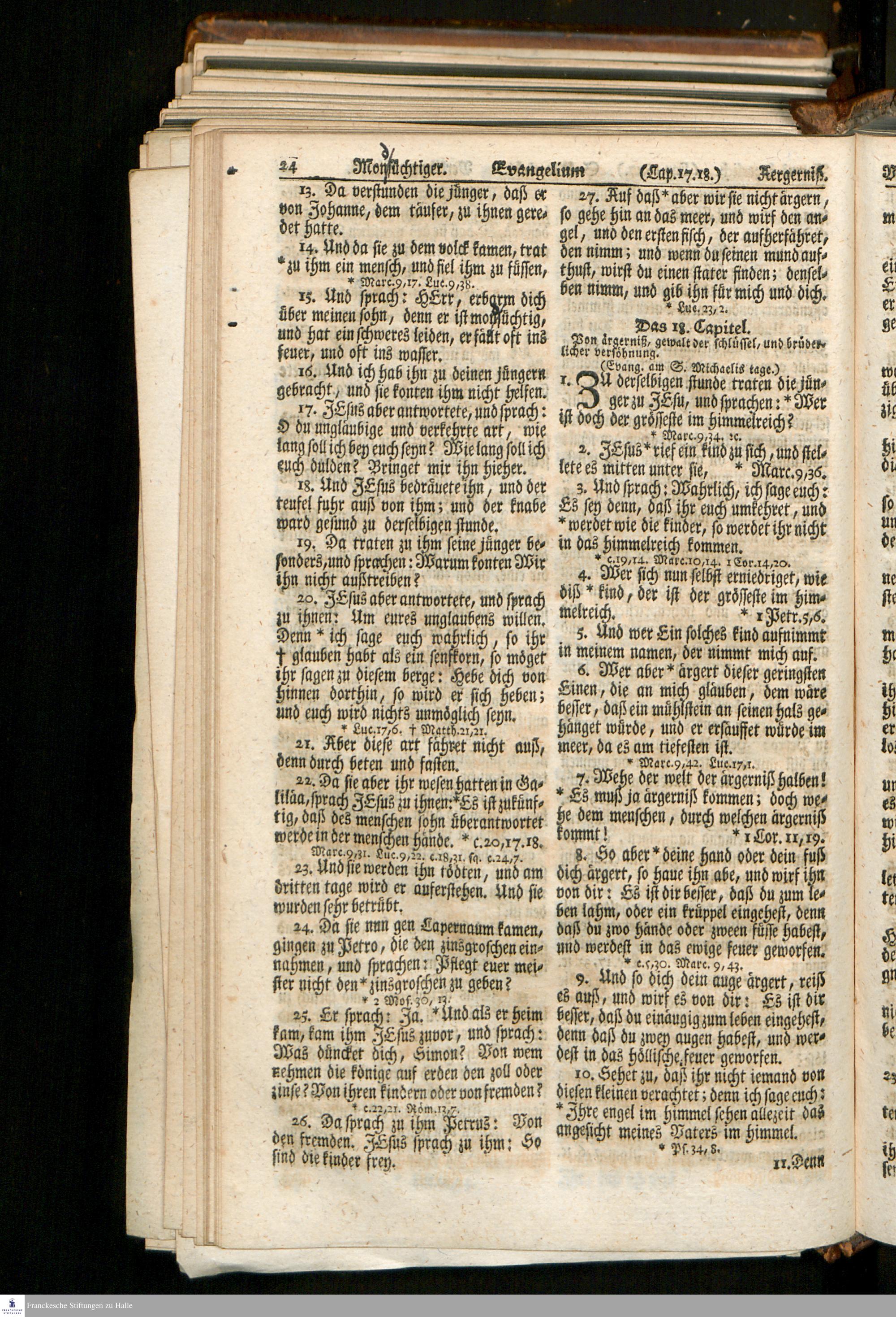 Biblia, Das ist: Die gantze Heil. Schrift Altes und Neues Testaments / Nach der Teutschen Ubersetzung D. Martin Luthers; Mit iedes Capitels kurtzen Summarien, auch beygefügten vielen und richtigen Parallelen; Mit fleiß übersehen/ und gegen einige/ sonderlich erstere/ Editiones des sel. Mannes gehalten, auch an unterschiedlichen Orten nach denselben eingerichtet, und von vielen in den bisherigen Exemplarien hin und wieder eingeschlichenen Fehlern gesaubert. Nebst einer Vorrede Herrn Baron Carl Hildebrands von Canstein