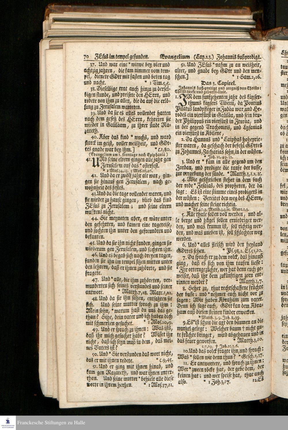 Biblia, Das ist: Die gantze Heil. Schrift Altes und Neues Testaments / Nach der Teutschen Ubersetzung D. Martin Luthers; Mit iedes Capitels kurtzen Summarien, auch beygefügten vielen und richtigen Parallelen; Mit fleiß übersehen/ und gegen einige/ sonderlich erstere/ Editiones des sel. Mannes gehalten, auch an unterschiedlichen Orten nach denselben eingerichtet, und von vielen in den bisherigen Exemplarien hin und wieder eingeschlichenen Fehlern gesaubert. Nebst einer Vorrede Herrn Baron Carl Hildebrands von Canstein