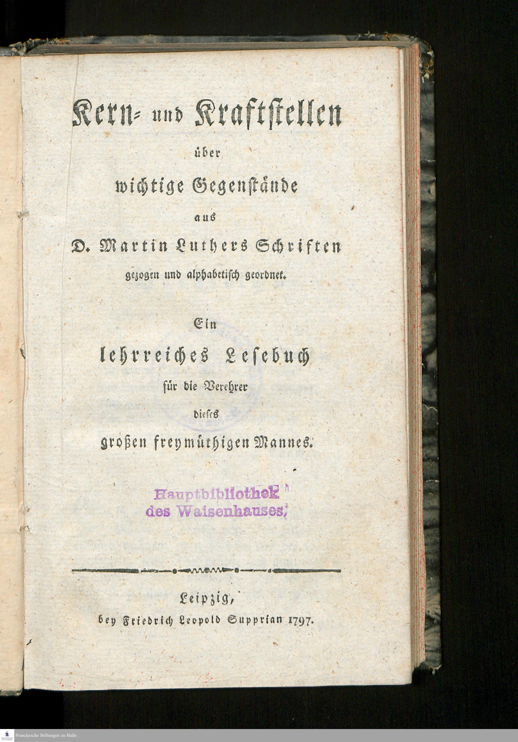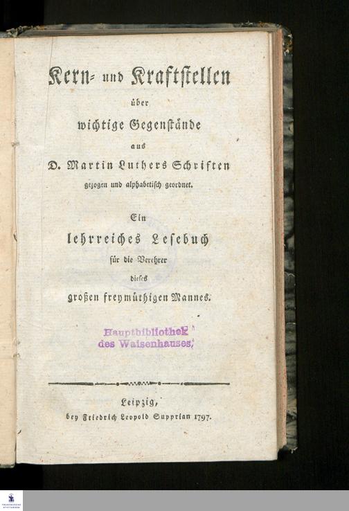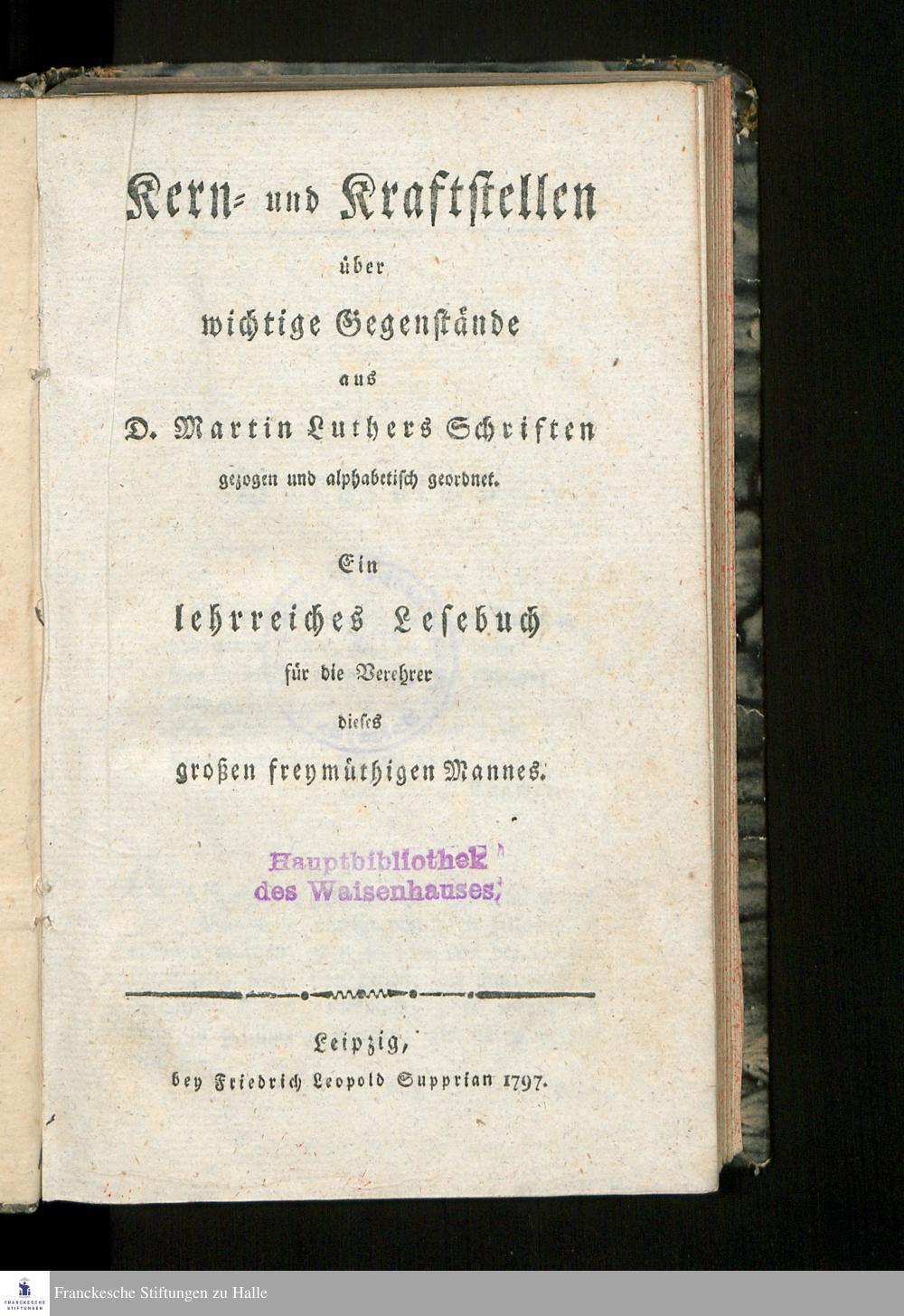 Kern- und Kraftstellen über wichtige Gegenstände aus D. Martin Luthers Schriften gezogen und alphabetisch geordnet : Ein lehrreiches Lesebuch für die Verehrer dieses großen freymüthigen Mannes / [Herausgeber: Motz, Joh. Frdr. Wilh.]