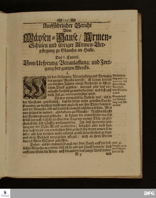 Die Fußstapffen Des noch lebenden und waltenden liebreichen und getreuen GOTTES / Zur Beschämung des Unglaubens / und Stärckung des Glaubens / Durch den Ausführlichen Bericht Vom Wäysen=Hause / Armen=Schulen / und übriger Armen=Verpflegung Zu Glaucha an Halle / Wie selbige fortgesetzet biß Ostern Anno 1701. Entdecket von August Hermann Francken / S.Th.Prof.Ord.und Past. [Spruch.] Mit Königl.Preußischen und Churfl.Brandenb.Privilegio. In Verlegung des Wäysen=Hauses zu Glaucha an Halle / 1701.