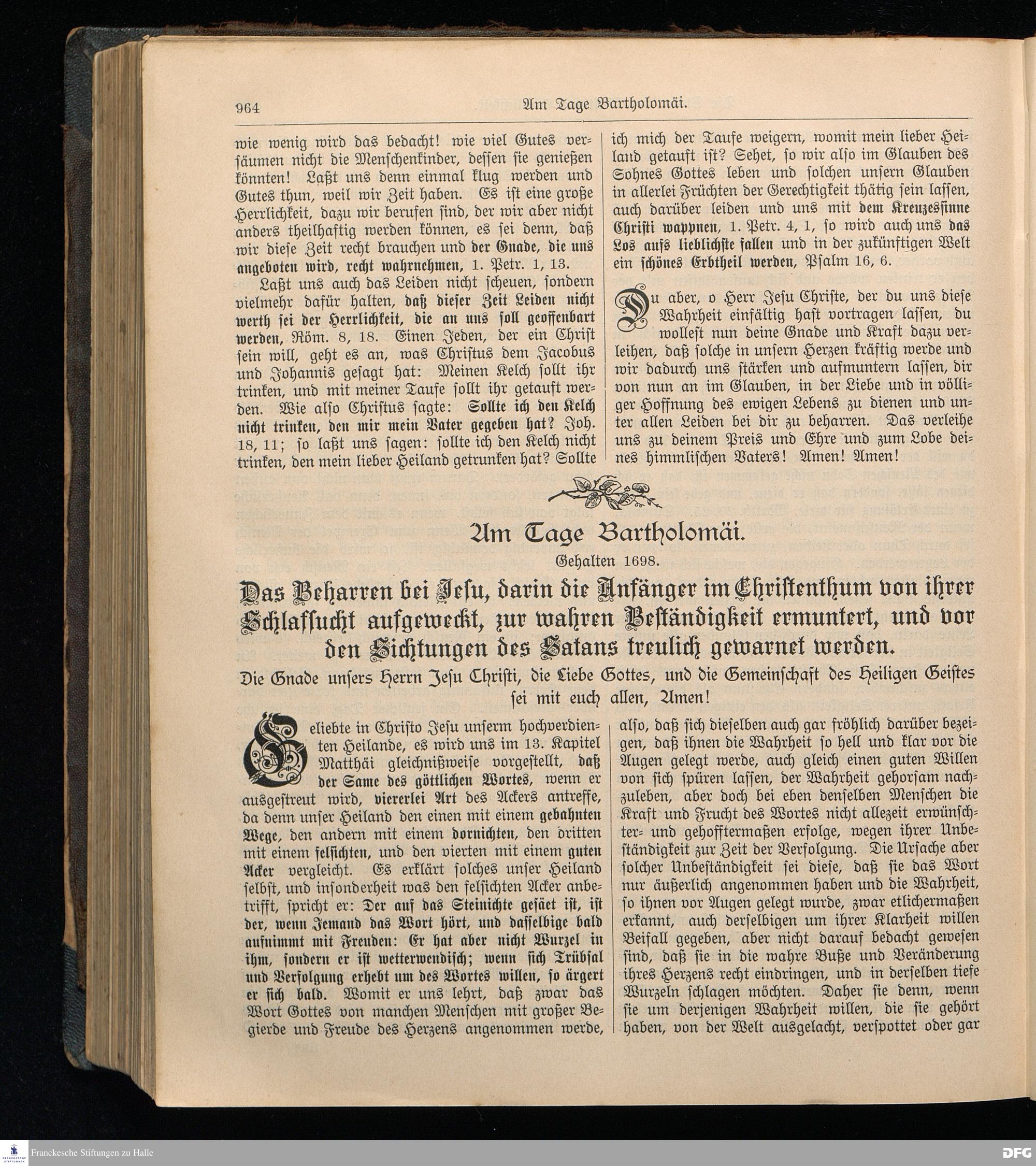 August Hermann Francke's weil.d.Theol.Prof.u.Pastor in Halle a.S., Sonn-, Fest- u. Aposteltags-Predigten, darinnen die zum wahren Christenthum gehörigen und vornehmsten Lehren behandelt sind. Aufs neue herausgegeben, verlegt und nur allein zu beziehen vom Ostpr.evang.Gebets=Verein in Berlin, Anklamstraße 31. Tilsit 1902. Gedruckt bei M. Jagomast.