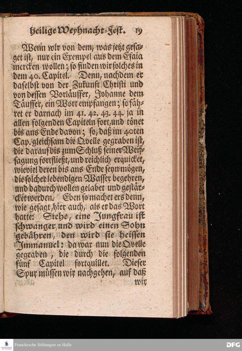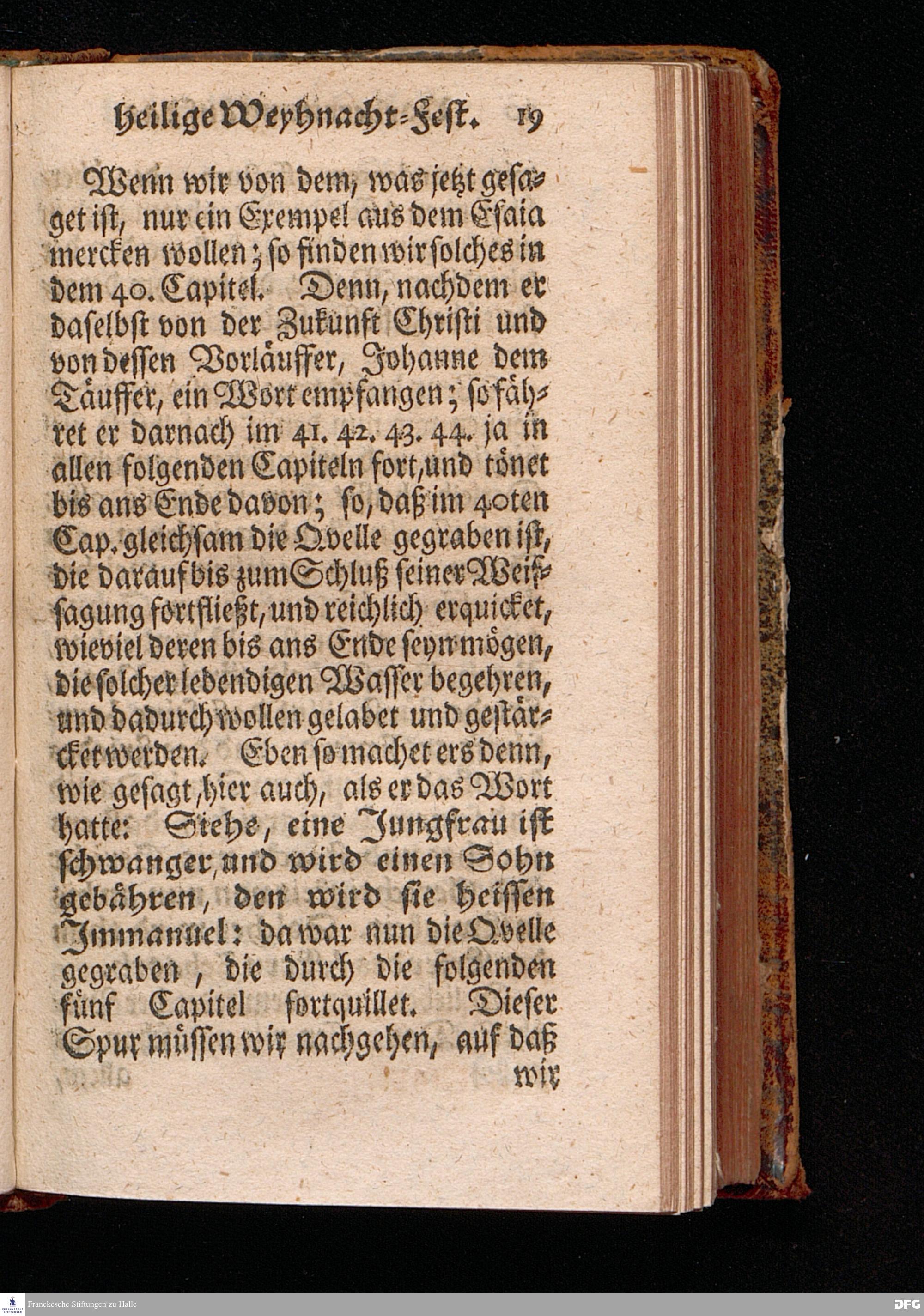 Vorbereitung auf das Weyhnacht=Fest / aus den Worten Jes.IX, 6.7. [Bibeltext;] den 23.Decembr.1720. in volckreicher Versammlung auf dem Wäysen=Hause zu Glaucha an Halle ertheilet von August Hermann Francken / S.Th.Prof.Past.Vlr.& Schol. Andere Auflage. HALLE, zu finden im Wäysen=Hause 1730.