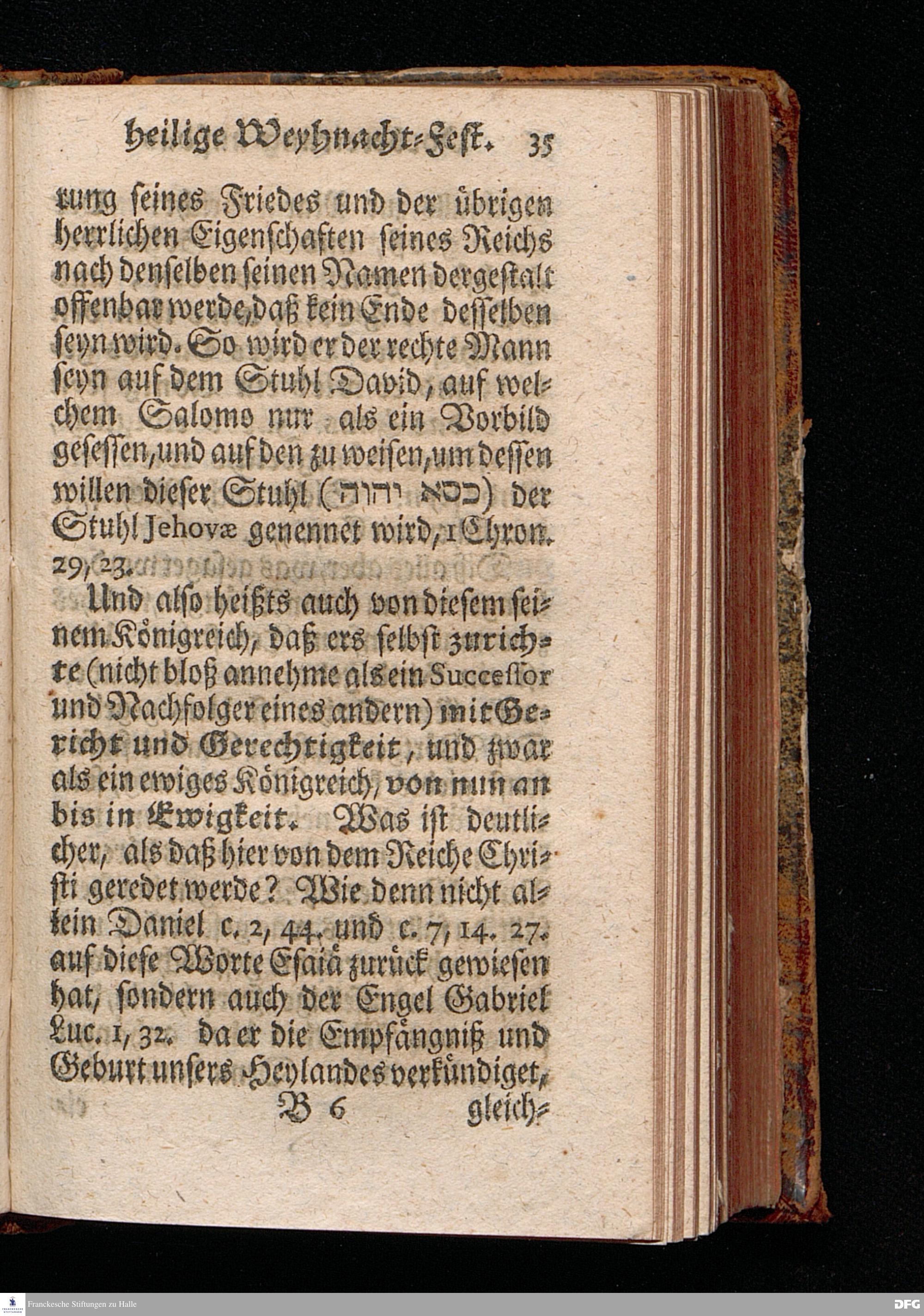 Vorbereitung auf das Weyhnacht=Fest / aus den Worten Jes.IX, 6.7. [Bibeltext;] den 23.Decembr.1720. in volckreicher Versammlung auf dem Wäysen=Hause zu Glaucha an Halle ertheilet von August Hermann Francken / S.Th.Prof.Past.Vlr.& Schol. Andere Auflage. HALLE, zu finden im Wäysen=Hause 1730.