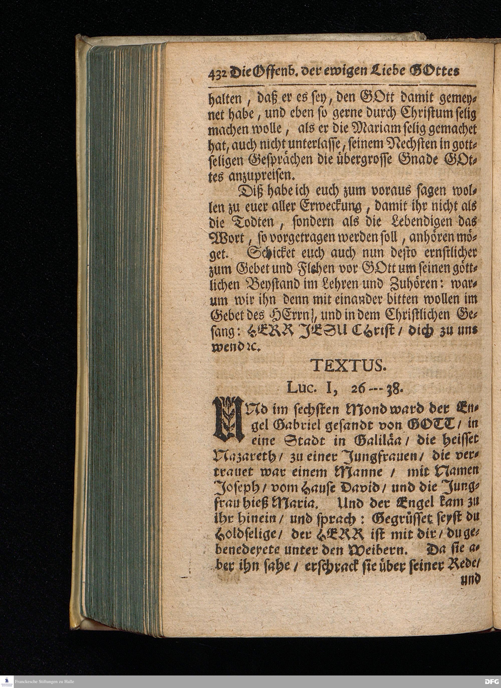August Hermann Franckens / S.Theol.Prof.& Past. zu S.Ulrich, und des Gymnasii Scholarchæ, Kurtze Sonn= und Fest=Tags=Predigten / Darinnen Vornemlich zum wahren / lebendigen / Kraft=vollen und in guten Früchten sich beweisenden Glauben, die nöthige Aufweckung und Anweisung gegeben wird. Die andere EDITION, mit einer neuen Vorrede und einem Register versehen. HALLE, in Verlegung des Wäysen=Hause MDCCXVIII.