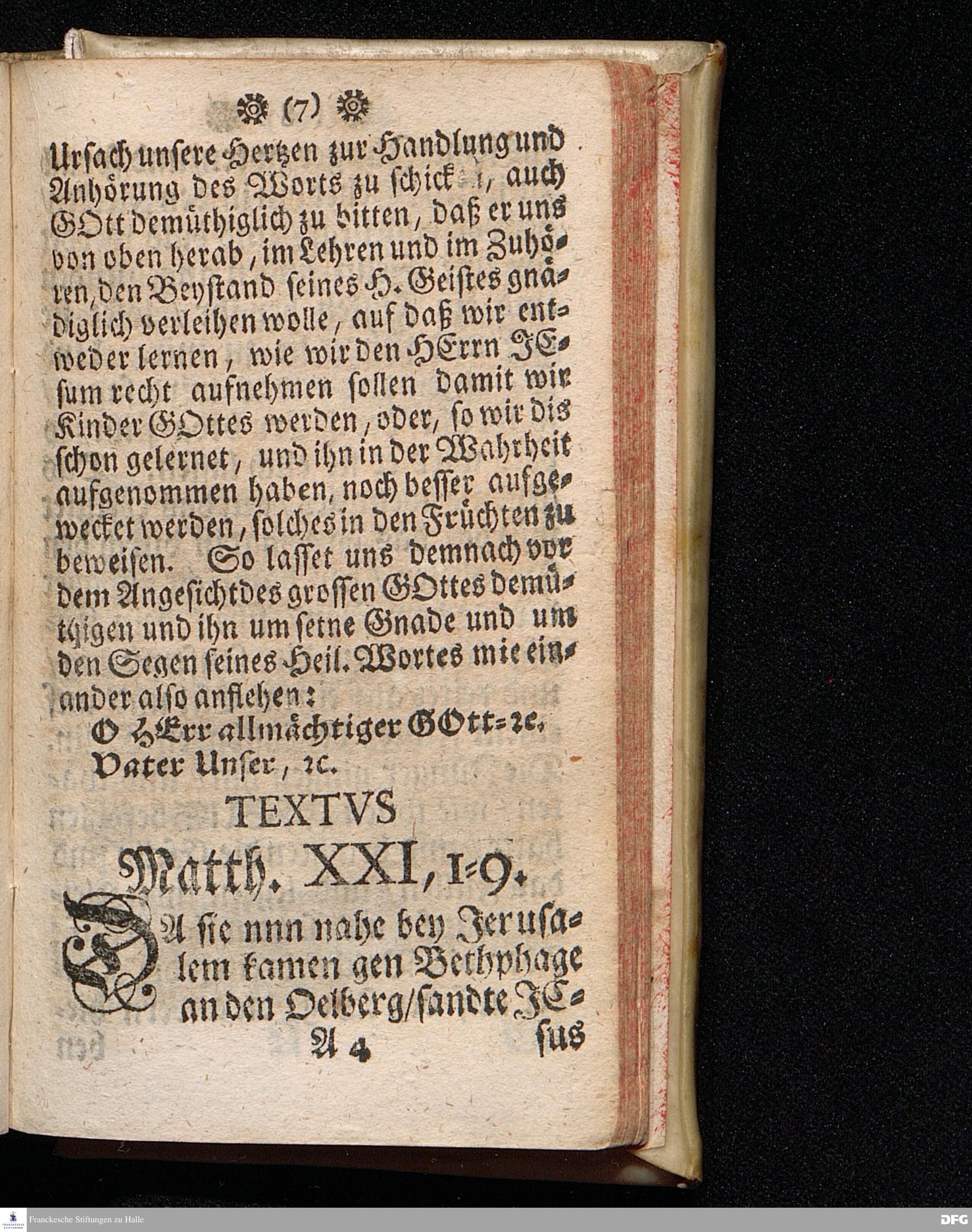 Spiegel der Aufnahme CHRISTI In dem Exempel derer / die Ihn aufgenommen und nicht aufgenommen haben, Zur Nachfolge und Warnung, Am 1sten Advents=Soñtage A.1717. aus Matth.21, 1==9. In einer auf der Universität Tübingen liebreichst aufgetragenen, und in der Haupt=Kirche daselbst abgelegten Predigt vorgestellet Und auf Erfordern zum Druck gegeben von August Hermann Francken / S.Theol.Professore, Past. und Scholarcha zu Halle im Hertzogthum Magdeb. Dritte Auflage. Nach dem zu Stuttgart gedruckten Exemplar in Halle abgedruckt. 1723.