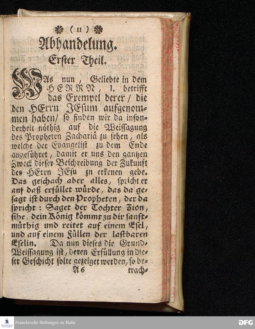 Spiegel der Aufnahme CHRISTI In dem Exempel derer / die Ihn aufgenommen und nicht aufgenommen haben, Zur Nachfolge und Warnung, Am 1sten Advents=Soñtage A.1717. aus Matth.21, 1==9. In einer auf der Universität Tübingen liebreichst aufgetragenen, und in der Haupt=Kirche daselbst abgelegten Predigt vorgestellet Und auf Erfordern zum Druck gegeben von August Hermann Francken / S.Theol.Professore, Past. und Scholarcha zu Halle im Hertzogthum Magdeb. Dritte Auflage. Nach dem zu Stuttgart gedruckten Exemplar in Halle abgedruckt. 1723.