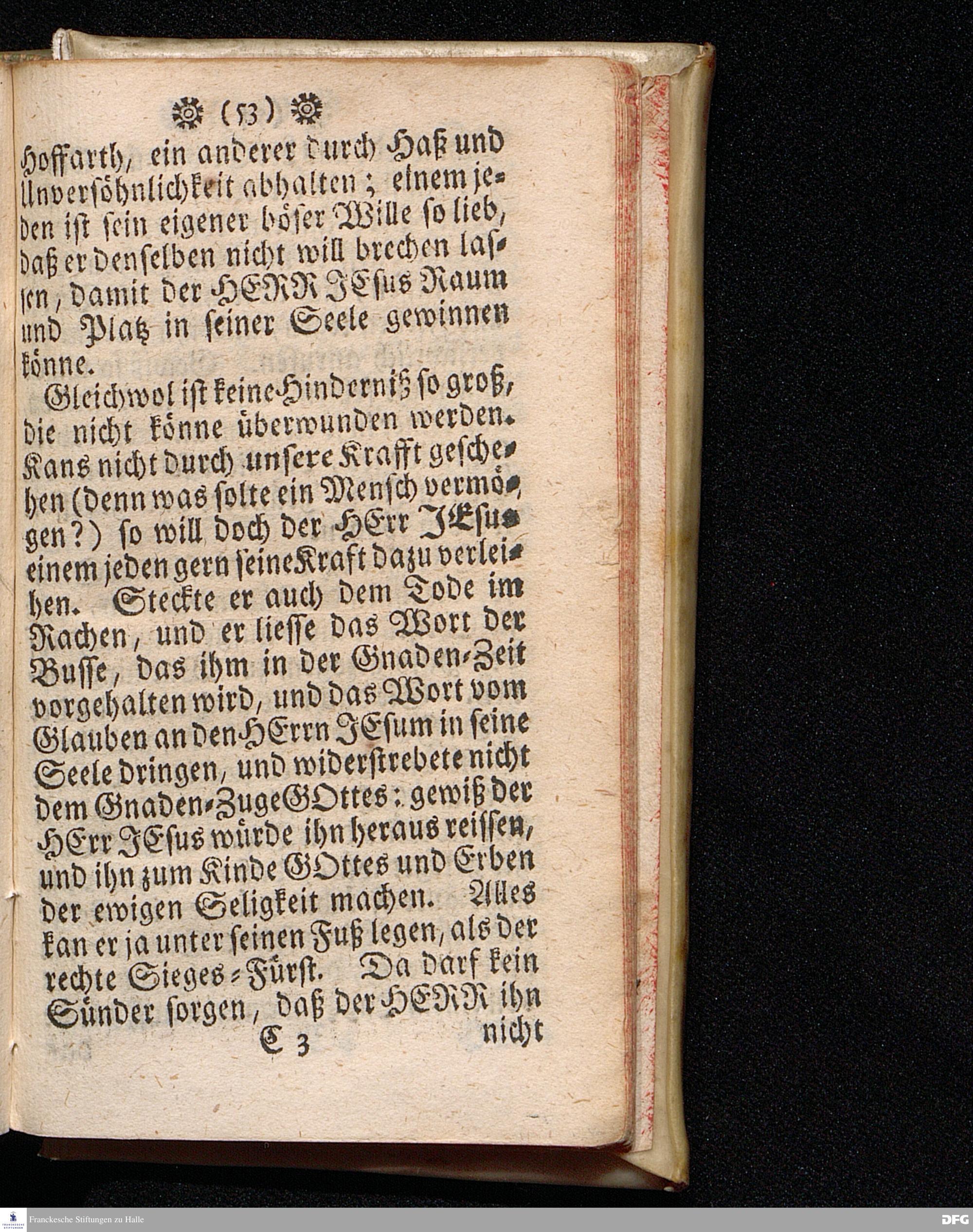 Spiegel der Aufnahme CHRISTI In dem Exempel derer / die Ihn aufgenommen und nicht aufgenommen haben, Zur Nachfolge und Warnung, Am 1sten Advents=Soñtage A.1717. aus Matth.21, 1==9. In einer auf der Universität Tübingen liebreichst aufgetragenen, und in der Haupt=Kirche daselbst abgelegten Predigt vorgestellet Und auf Erfordern zum Druck gegeben von August Hermann Francken / S.Theol.Professore, Past. und Scholarcha zu Halle im Hertzogthum Magdeb. Dritte Auflage. Nach dem zu Stuttgart gedruckten Exemplar in Halle abgedruckt. 1723.