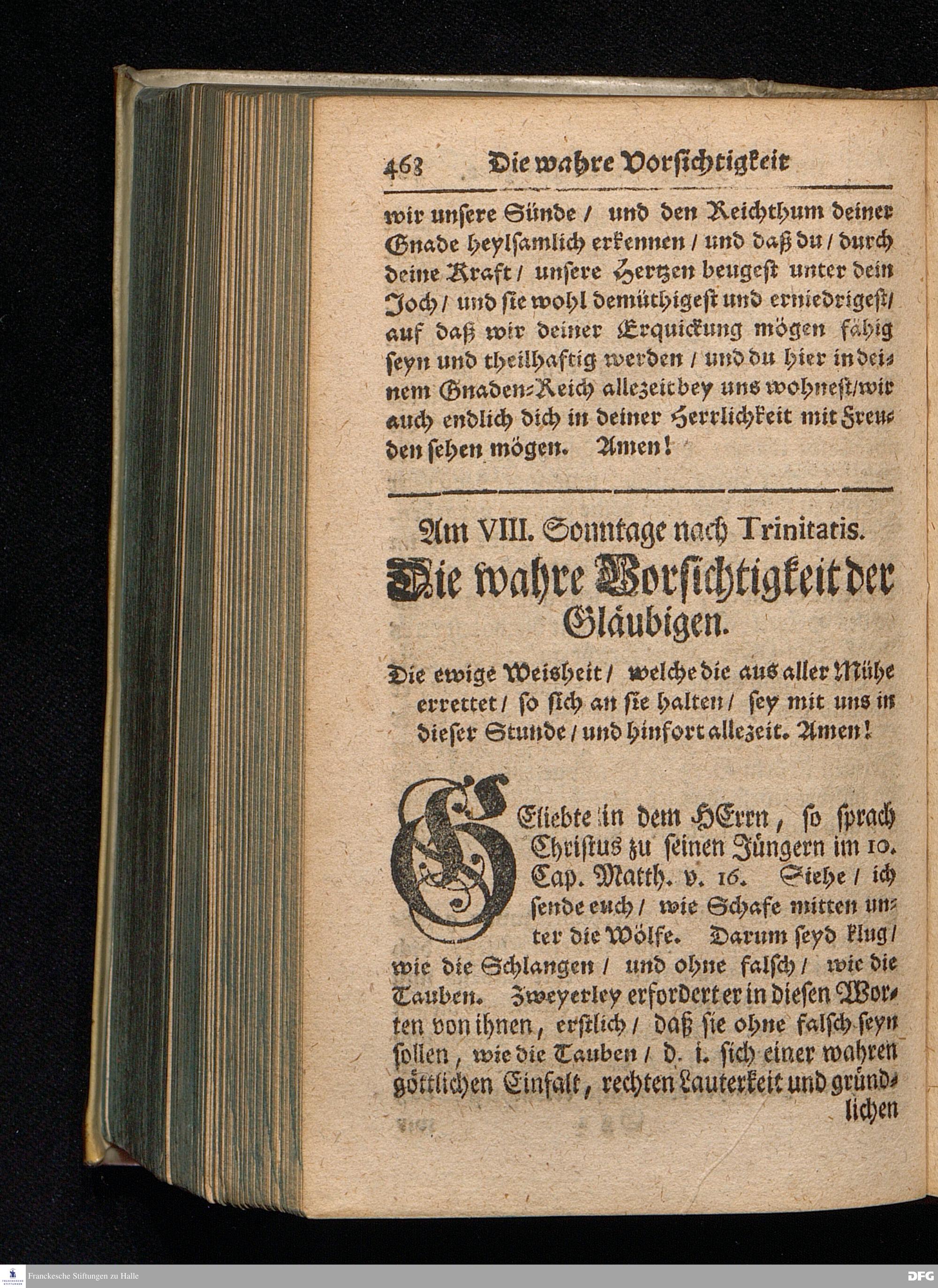 August Hermann Franckens / S.Theol.Prof.& Past. zu S.Ulrich, und des Gymnasii Scholarchæ, Kurtze Sonn= und Fest=Tags=Predigten / Darinnen Vornemlich zum wahren / lebendigen / Kraft=vollen und in guten Früchten sich beweisenden Glauben, die nöthige Aufweckung und Anweisung gegeben wird. Die andere EDITION, mit einer neuen Vorrede und einem Register versehen. HALLE, in Verlegung des Wäysen=Hause MDCCXVIII.