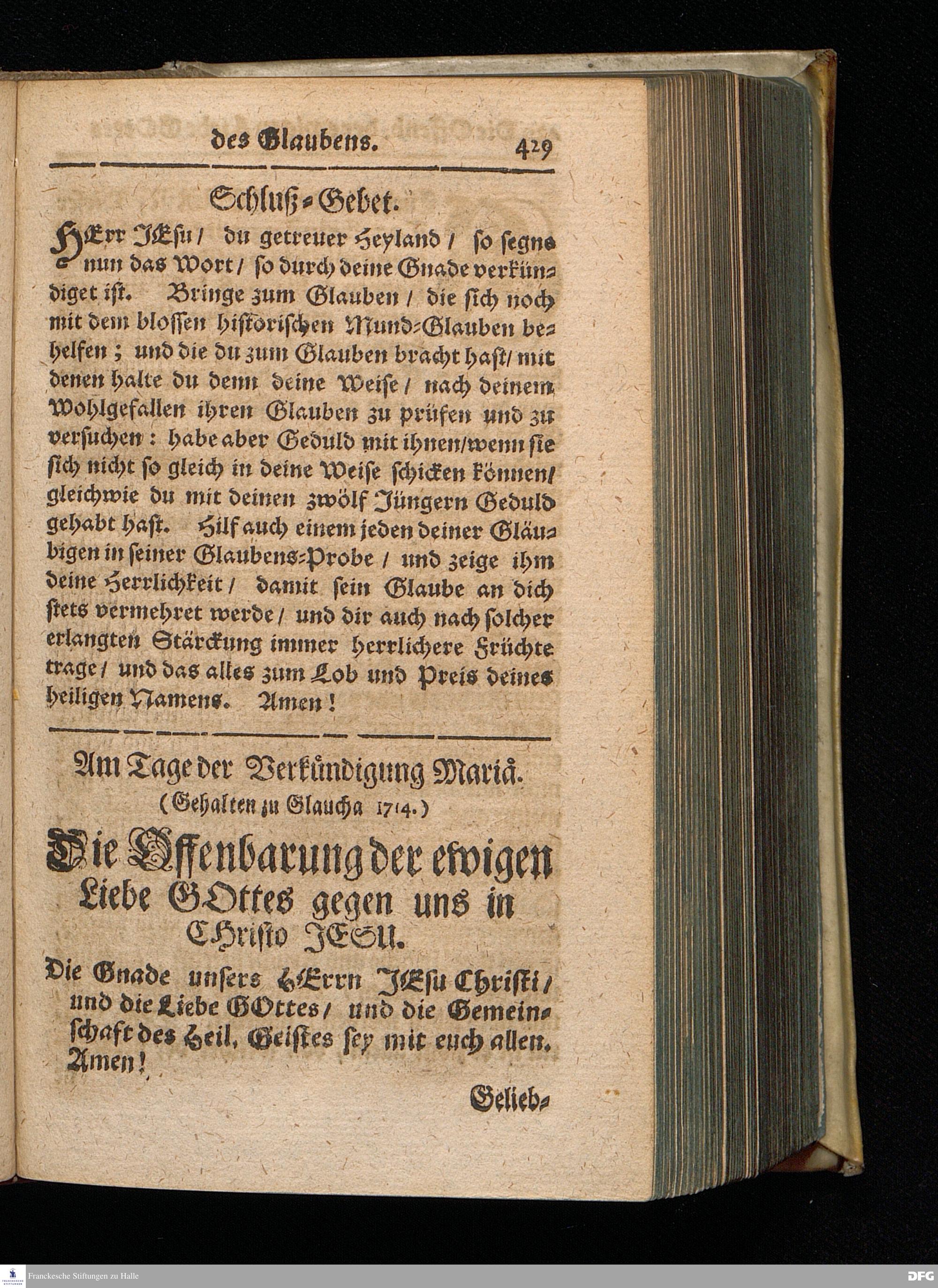 August Hermann Franckens / S.Theol.Prof.& Past. zu S.Ulrich, und des Gymnasii Scholarchæ, Kurtze Sonn= und Fest=Tags=Predigten / Darinnen Vornemlich zum wahren / lebendigen / Kraft=vollen und in guten Früchten sich beweisenden Glauben, die nöthige Aufweckung und Anweisung gegeben wird. Die andere EDITION, mit einer neuen Vorrede und einem Register versehen. HALLE, in Verlegung des Wäysen=Hause MDCCXVIII.