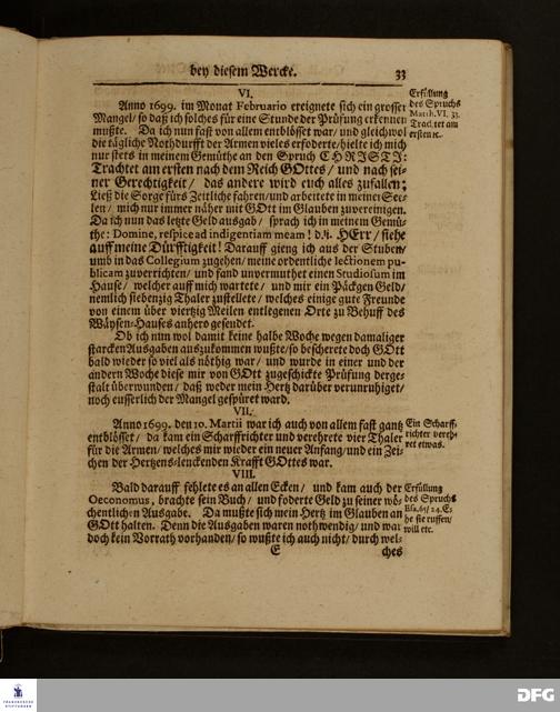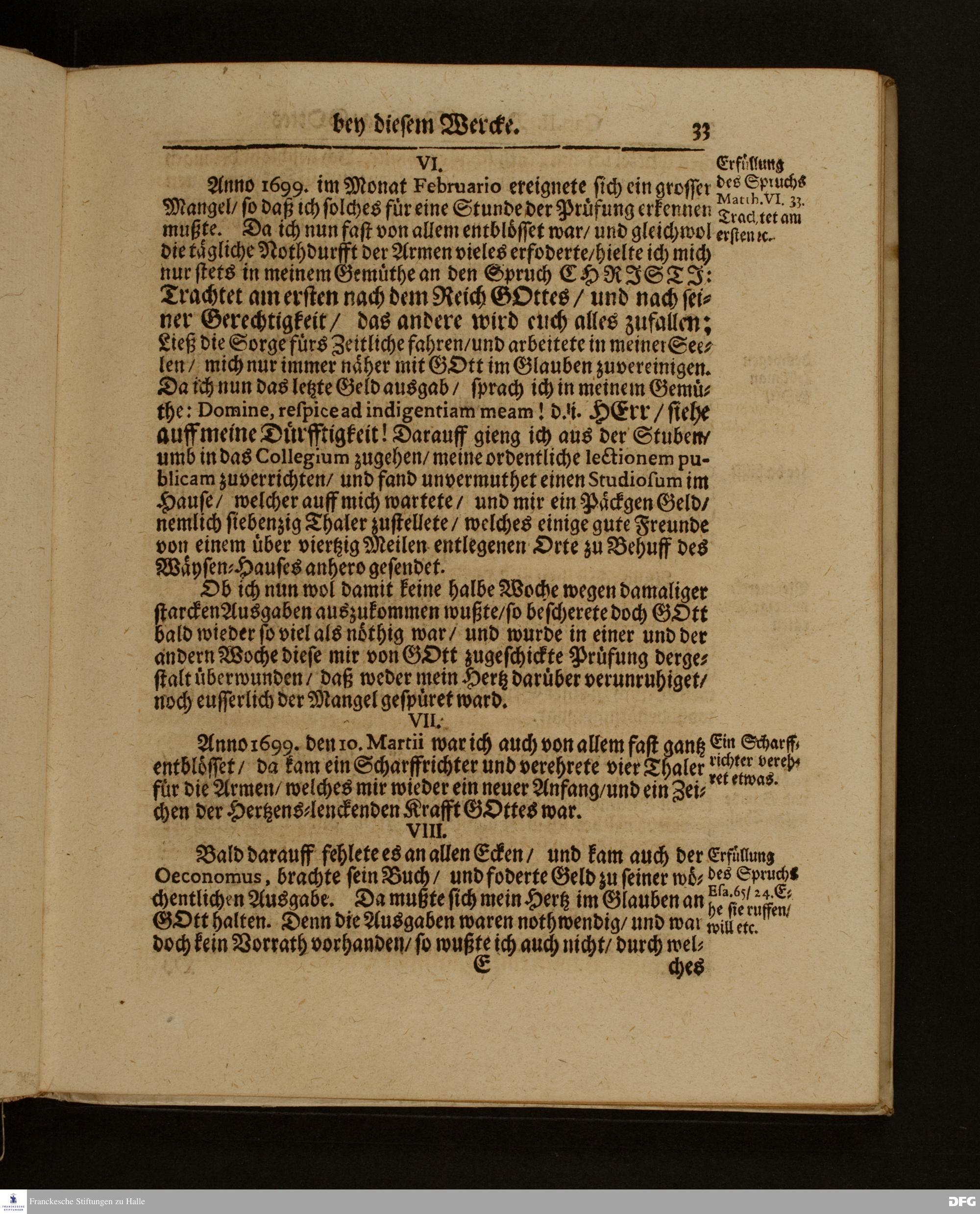 Die Fußstapffen Des noch lebenden und waltenden liebreichen und getreuen GOTTES / Zur Beschämung des Unglaubens / und Stärckung des Glaubens / Durch den Ausführlichen Bericht Vom Wäysen=Hause / Armen=Schulen / und übriger Armen=Verpflegung Zu Glaucha an Halle / Wie selbige fortgesetzet biß Ostern Anno 1701. Entdecket von August Hermann Francken / S.Th.Prof.Ord.und Past. [Spruch.] Mit Königl.Preußischen und Churfl.Brandenb.Privilegio. In Verlegung des Wäysen=Hauses zu Glaucha an Halle / 1701.