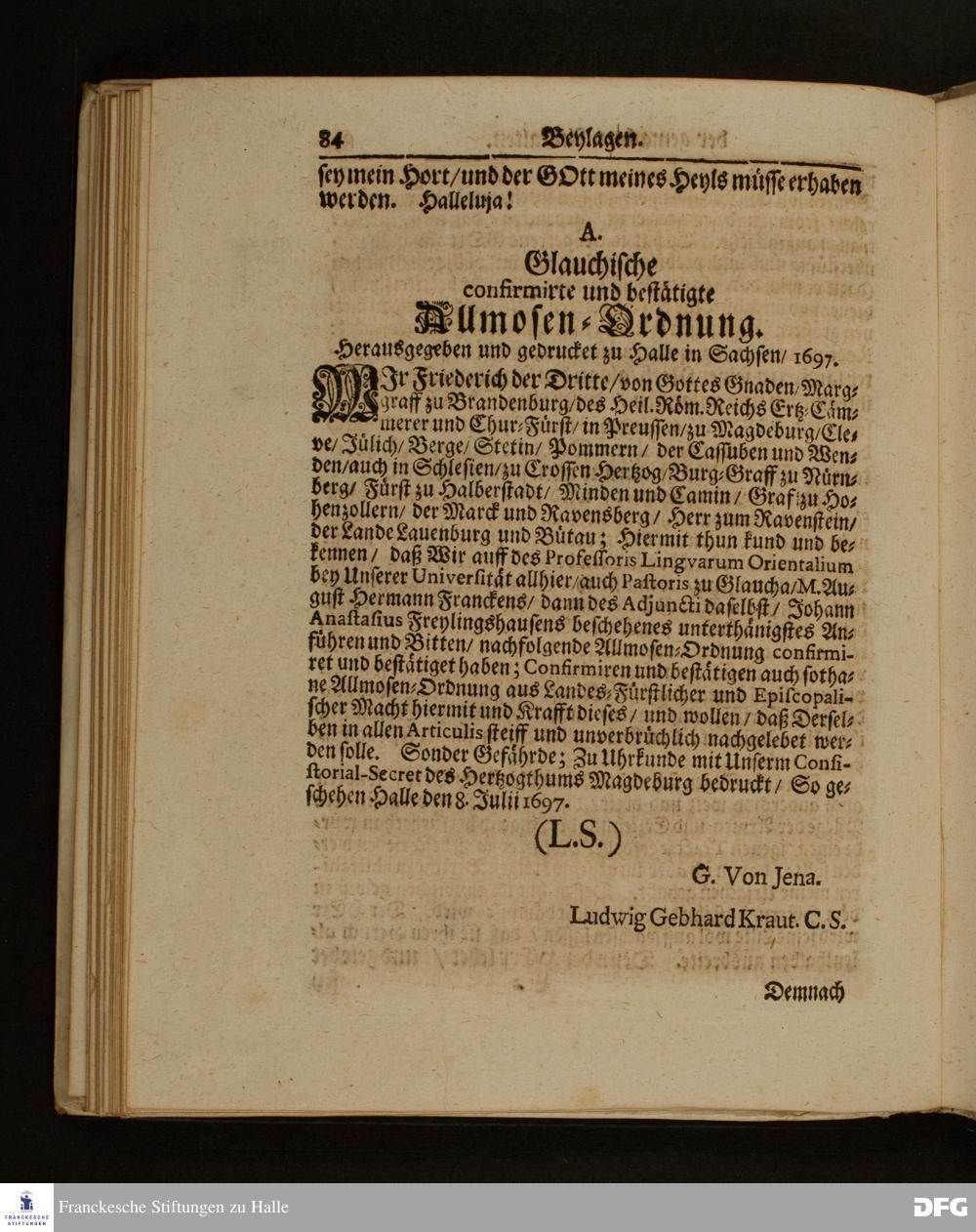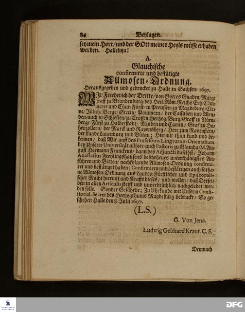 Die Fußstapffen Des noch lebenden und waltenden liebreichen und getreuen GOTTES / Zur Beschämung des Unglaubens / und Stärckung des Glaubens / Durch den Ausführlichen Bericht Vom Wäysen=Hause / Armen=Schulen / und übriger Armen=Verpflegung Zu Glaucha an Halle / Wie selbige fortgesetzet biß Ostern Anno 1701. Entdecket von August Hermann Francken / S.Th.Prof.Ord.und Past. [Spruch.] Mit Königl.Preußischen und Churfl.Brandenb.Privilegio. In Verlegung des Wäysen=Hauses zu Glaucha an Halle / 1701.
