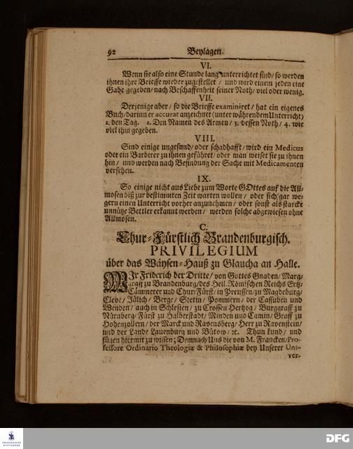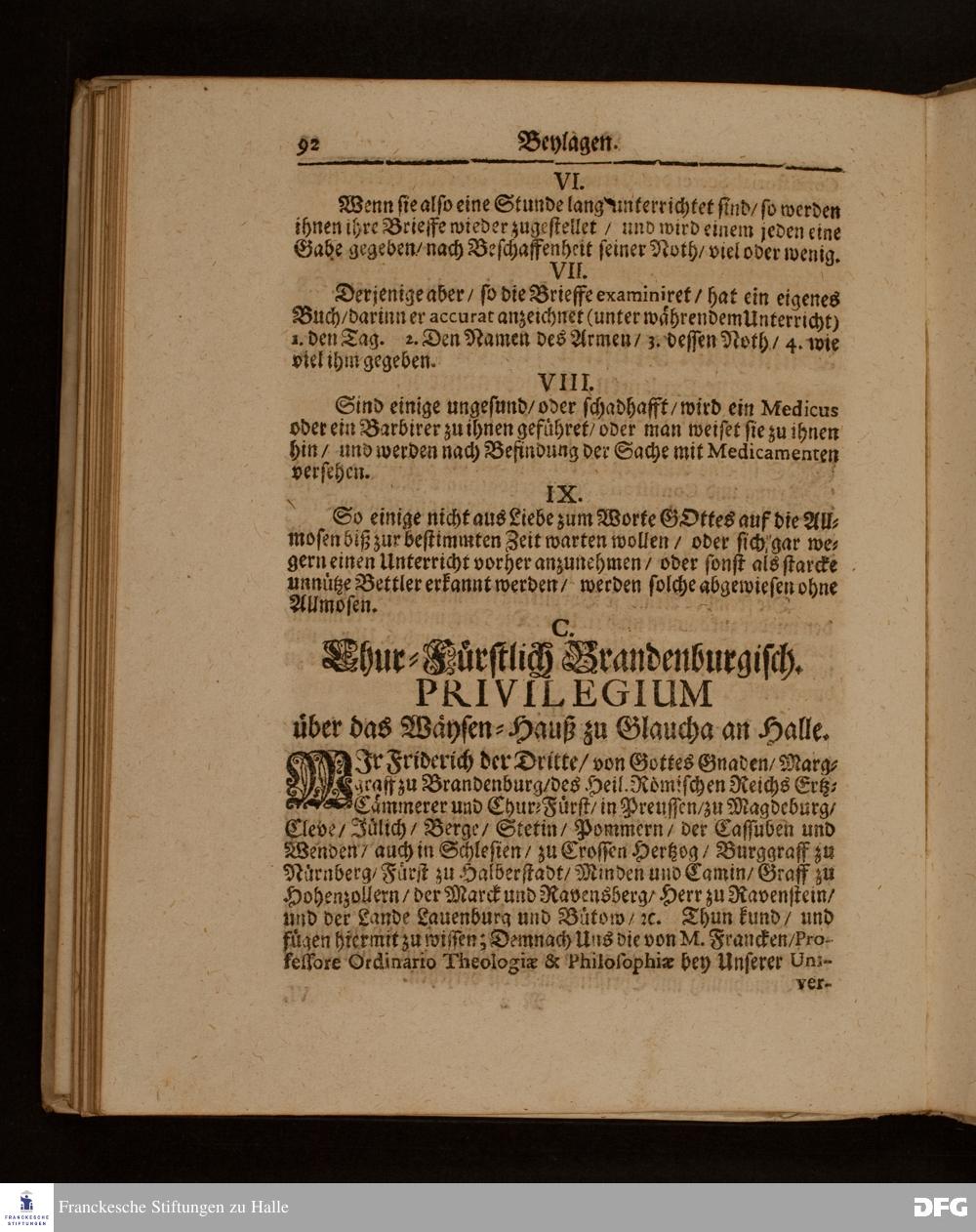 Die Fußstapffen Des noch lebenden und waltenden liebreichen und getreuen GOTTES / Zur Beschämung des Unglaubens / und Stärckung des Glaubens / Durch den Ausführlichen Bericht Vom Wäysen=Hause / Armen=Schulen / und übriger Armen=Verpflegung Zu Glaucha an Halle / Wie selbige fortgesetzet biß Ostern Anno 1701. Entdecket von August Hermann Francken / S.Th.Prof.Ord.und Past. [Spruch.] Mit Königl.Preußischen und Churfl.Brandenb.Privilegio. In Verlegung des Wäysen=Hauses zu Glaucha an Halle / 1701.