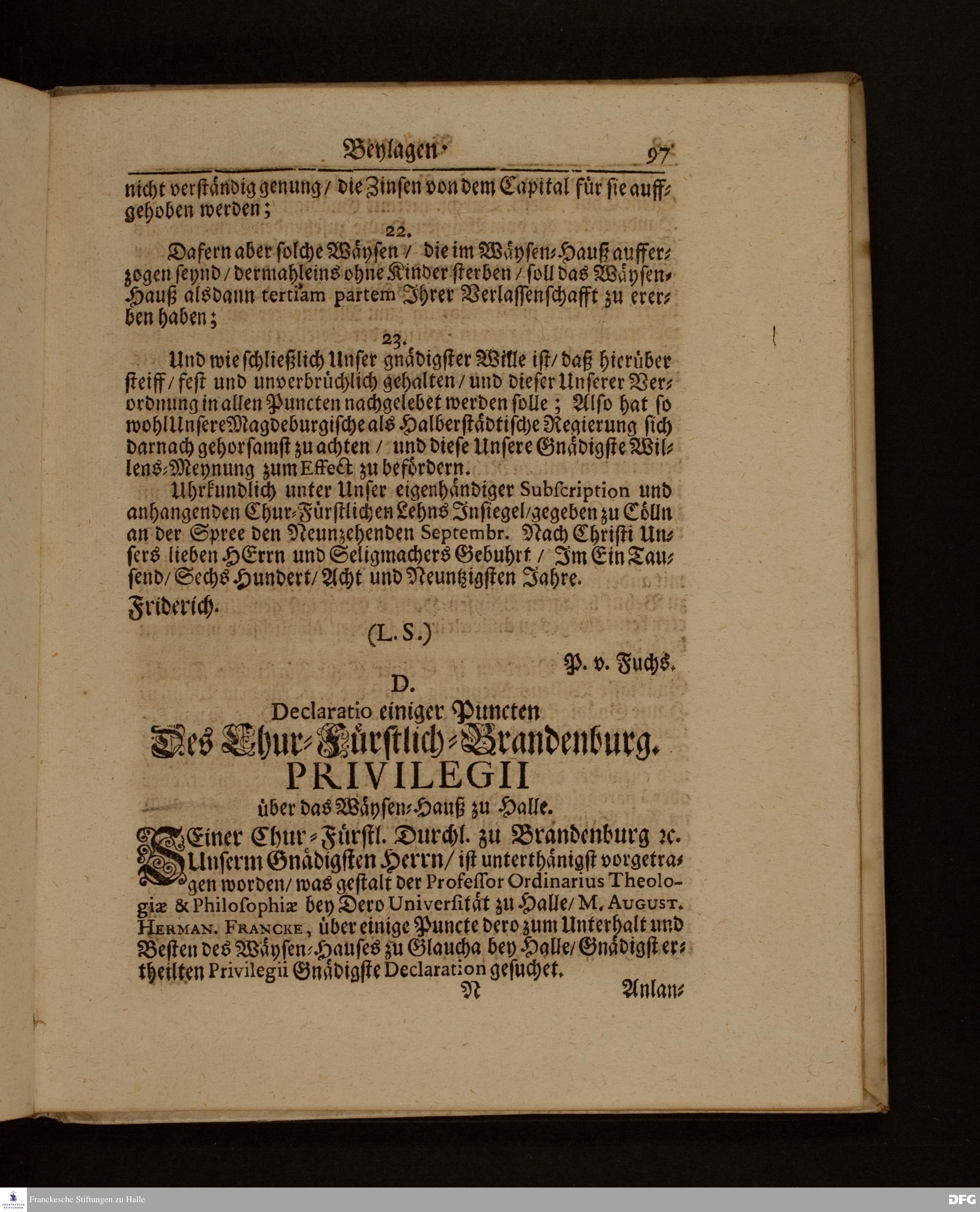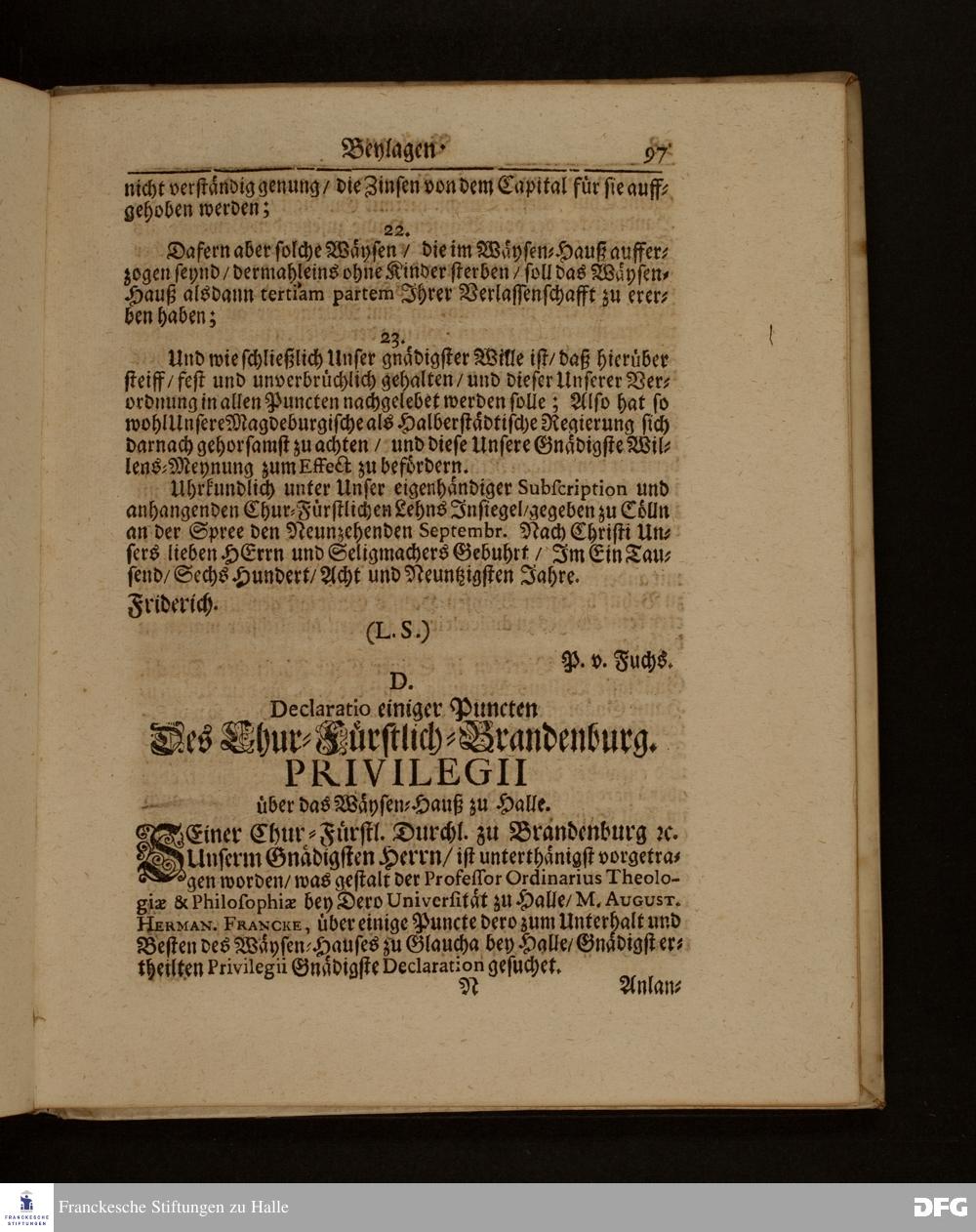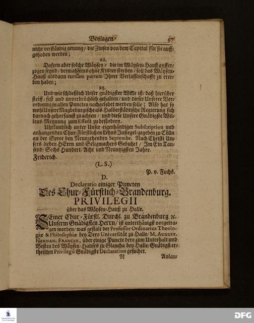 Die Fußstapffen Des noch lebenden und waltenden liebreichen und getreuen GOTTES / Zur Beschämung des Unglaubens / und Stärckung des Glaubens / Durch den Ausführlichen Bericht Vom Wäysen=Hause / Armen=Schulen / und übriger Armen=Verpflegung Zu Glaucha an Halle / Wie selbige fortgesetzet biß Ostern Anno 1701. Entdecket von August Hermann Francken / S.Th.Prof.Ord.und Past. [Spruch.] Mit Königl.Preußischen und Churfl.Brandenb.Privilegio. In Verlegung des Wäysen=Hauses zu Glaucha an Halle / 1701.
