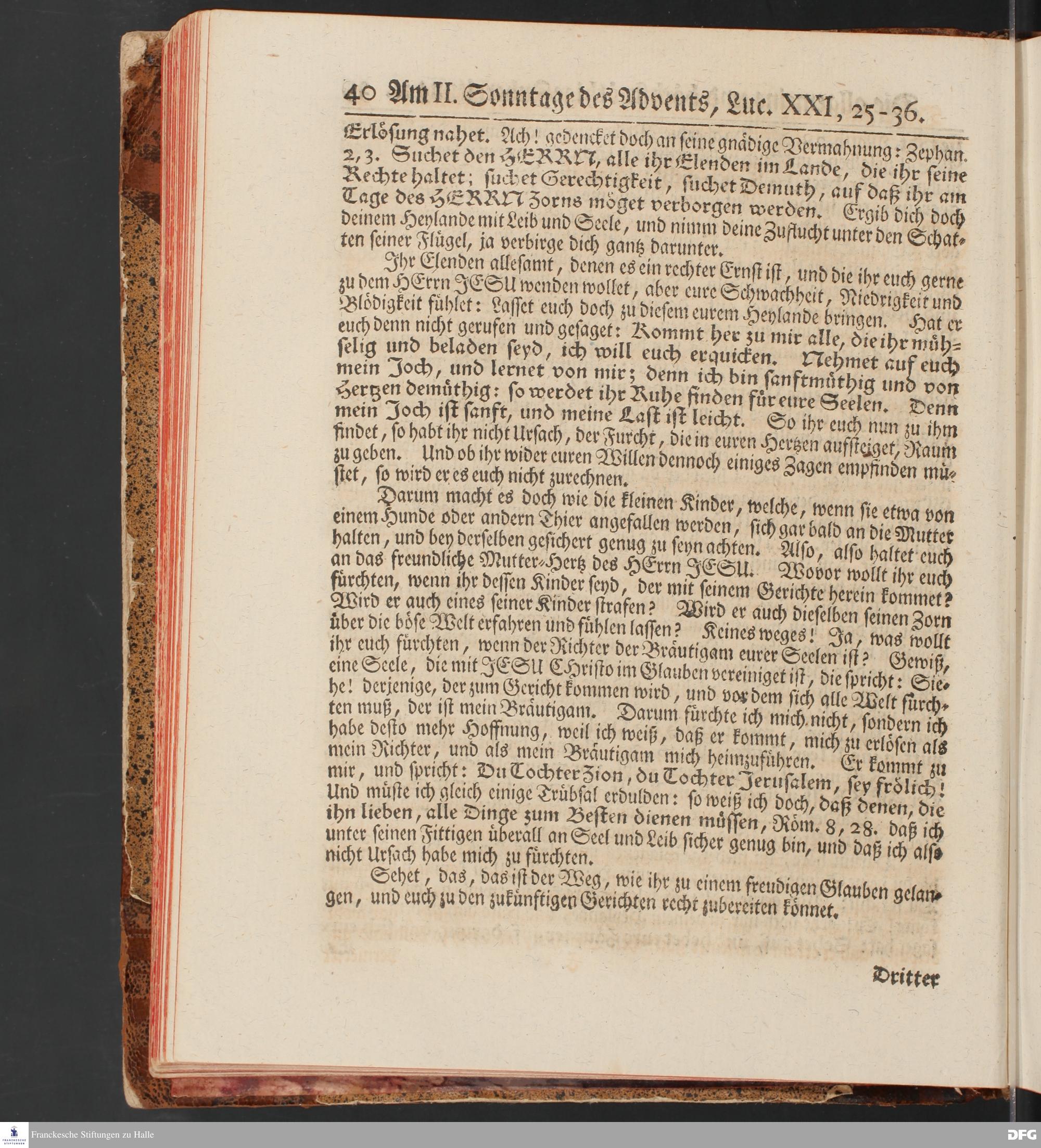 August Hermann Franckens, S.Theol.Prof.und Past. Sonn= und Fest=Tags=Predigten / Welche Theils in Halle, theils an verschiedenen auswärtigen Oertern, von wichtigen und auserlesenen Materien gehalten worden, Nebst Vorbereitung auf die hohen Feste und nützlichen Registern. Dritte Auflage. HALLE, gedruckt und verlegt im Wäysen=Hause MDCCXL. Mit Königl.Preuß.und Churfl.Brandenb.Privileg.