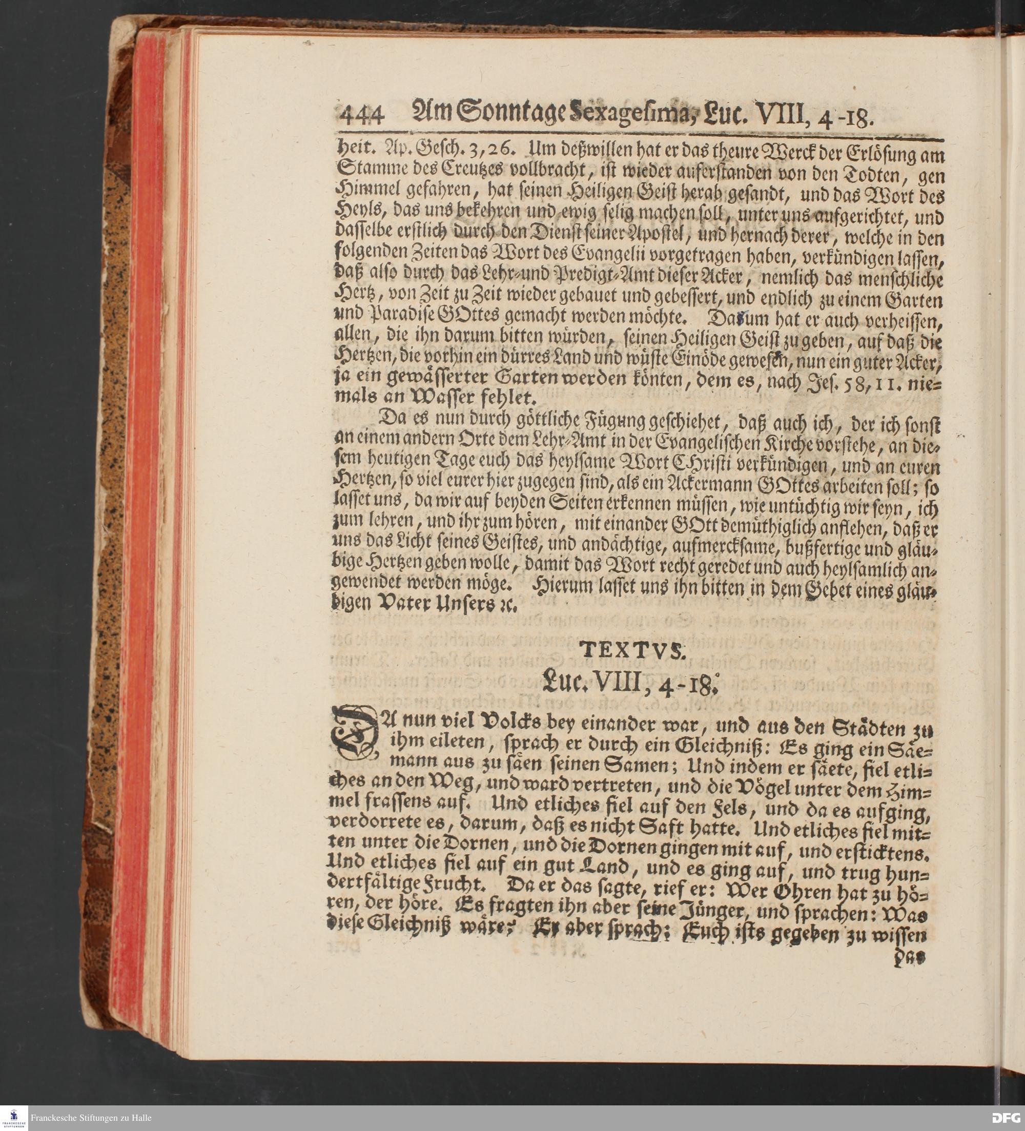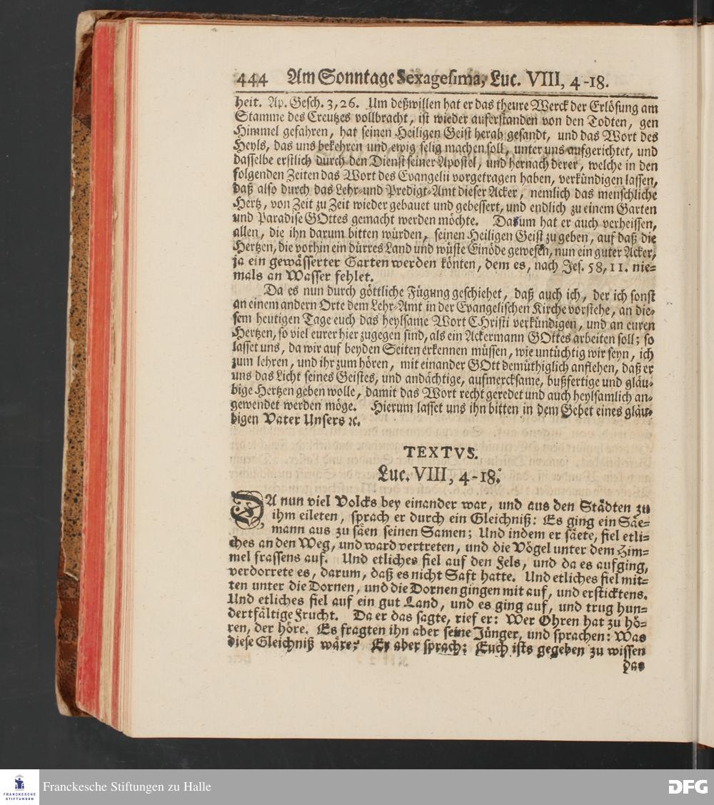 August Hermann Franckens, S.Theol.Prof.und Past. Sonn= und Fest=Tags=Predigten / Welche Theils in Halle, theils an verschiedenen auswärtigen Oertern, von wichtigen und auserlesenen Materien gehalten worden, Nebst Vorbereitung auf die hohen Feste und nützlichen Registern. Dritte Auflage. HALLE, gedruckt und verlegt im Wäysen=Hause MDCCXL. Mit Königl.Preuß.und Churfl.Brandenb.Privileg.