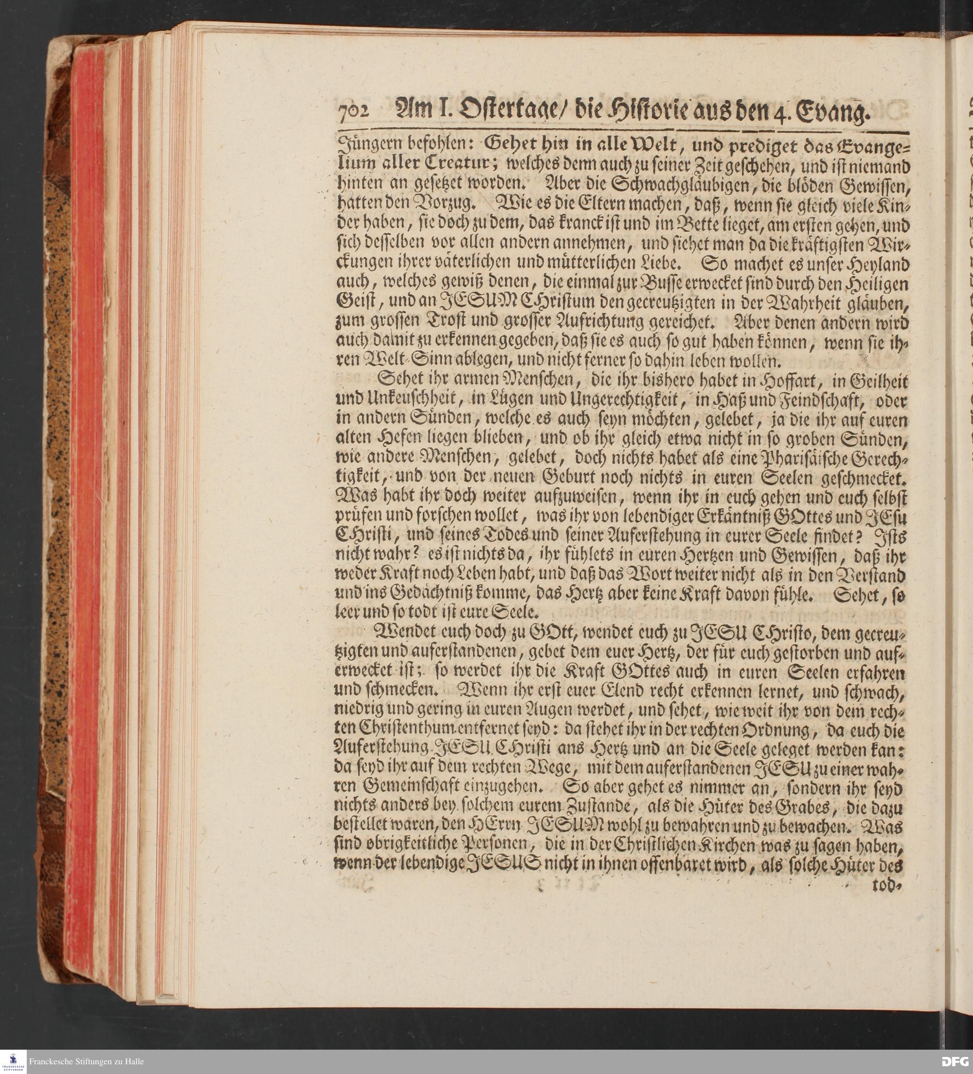 August Hermann Franckens, S.Theol.Prof.und Past. Sonn= und Fest=Tags=Predigten / Welche Theils in Halle, theils an verschiedenen auswärtigen Oertern, von wichtigen und auserlesenen Materien gehalten worden, Nebst Vorbereitung auf die hohen Feste und nützlichen Registern. Dritte Auflage. HALLE, gedruckt und verlegt im Wäysen=Hause MDCCXL. Mit Königl.Preuß.und Churfl.Brandenb.Privileg.