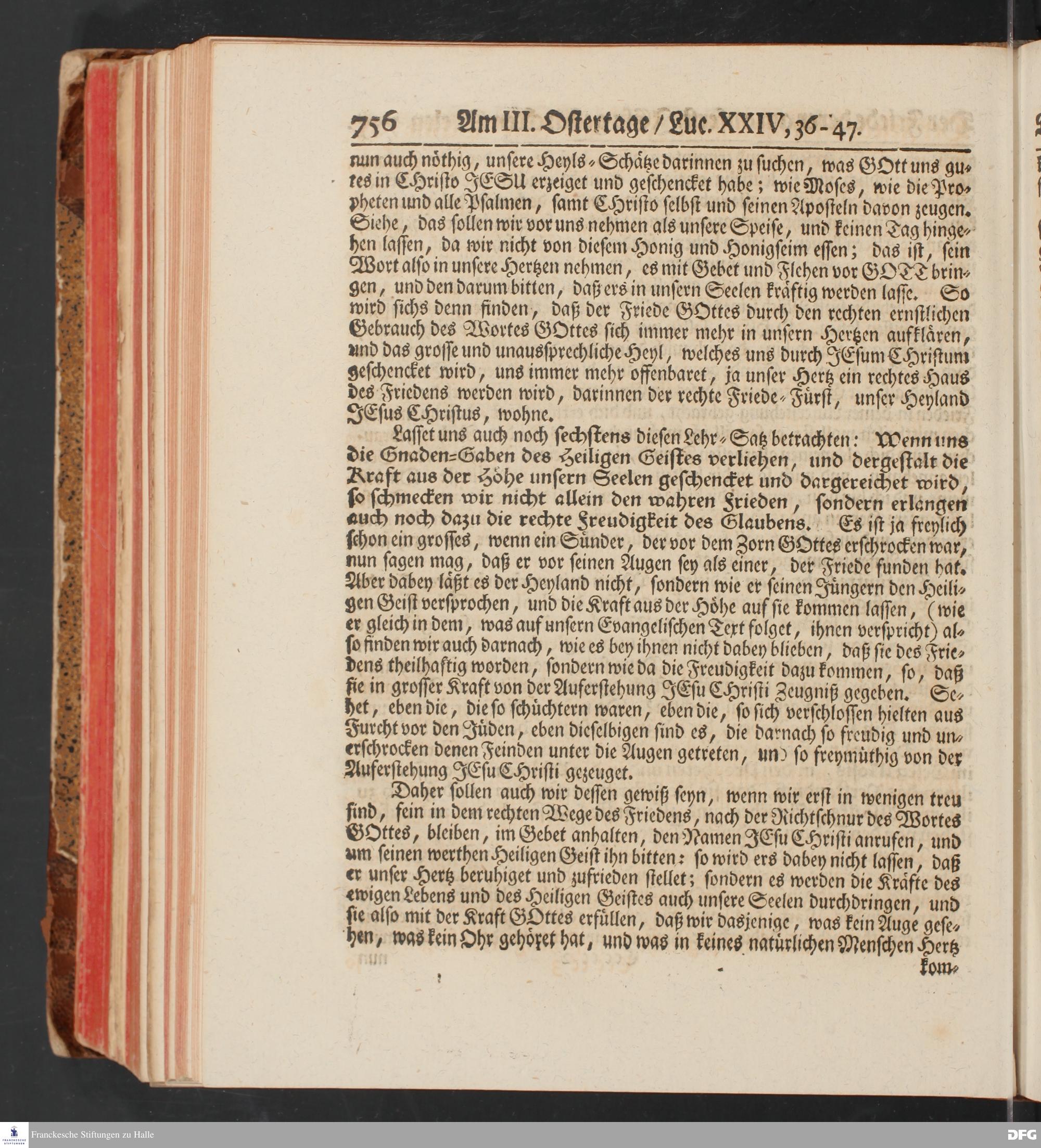 August Hermann Franckens, S.Theol.Prof.und Past. Sonn= und Fest=Tags=Predigten / Welche Theils in Halle, theils an verschiedenen auswärtigen Oertern, von wichtigen und auserlesenen Materien gehalten worden, Nebst Vorbereitung auf die hohen Feste und nützlichen Registern. Dritte Auflage. HALLE, gedruckt und verlegt im Wäysen=Hause MDCCXL. Mit Königl.Preuß.und Churfl.Brandenb.Privileg.