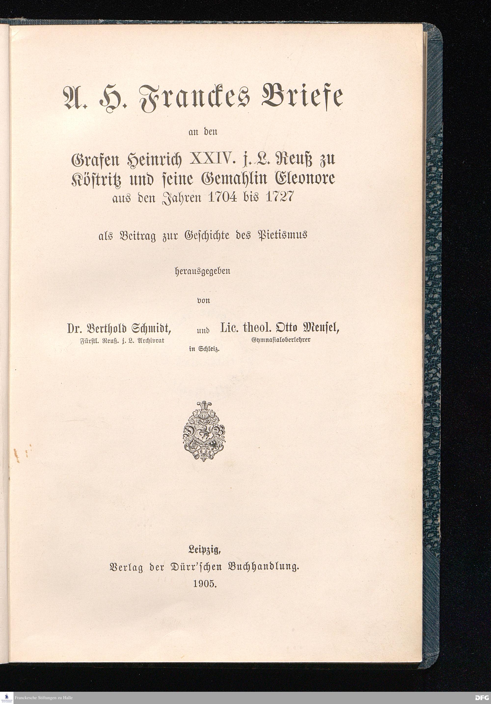 A.H.Franckes Briefe an den Grafen Heinrich XXIV. j.L. Reuß zu Köstritz und seine Gemahlin Eleonore aus den Jahren 1704 bis 1727 als Beitrag zur Geschichte des Pietismus herausgegeben von Dr.Berthold Schmidt Fürstl.Reuß j.L.Archivrat und Lic.theol. Otto Meusel Gymnasialoberlehrer in Schleiz. Leipzig, Verlag der Dürr'schen Buchhandlung 1905.