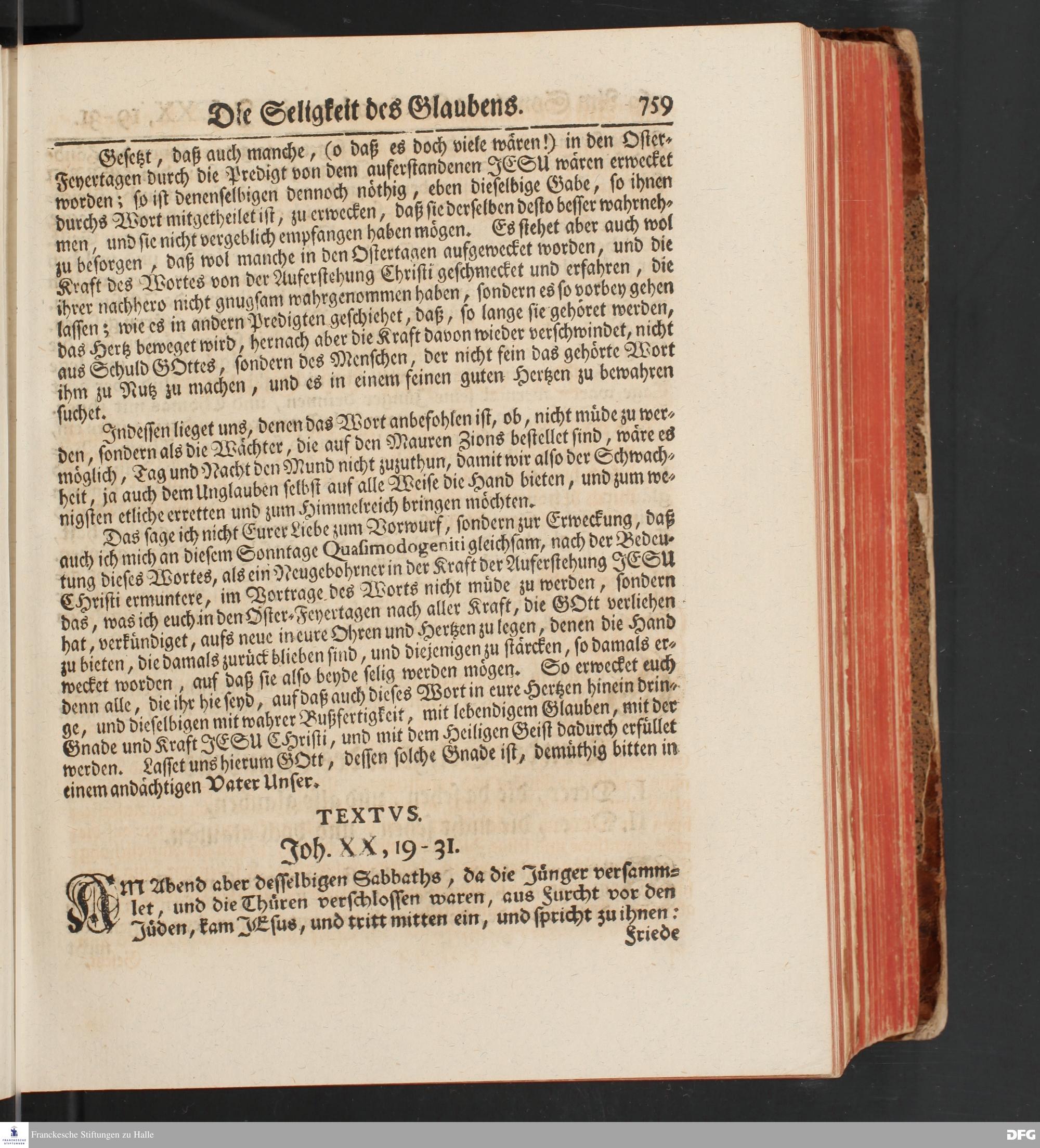 August Hermann Franckens, S.Theol.Prof.und Past. Sonn= und Fest=Tags=Predigten / Welche Theils in Halle, theils an verschiedenen auswärtigen Oertern, von wichtigen und auserlesenen Materien gehalten worden, Nebst Vorbereitung auf die hohen Feste und nützlichen Registern. Dritte Auflage. HALLE, gedruckt und verlegt im Wäysen=Hause MDCCXL. Mit Königl.Preuß.und Churfl.Brandenb.Privileg.