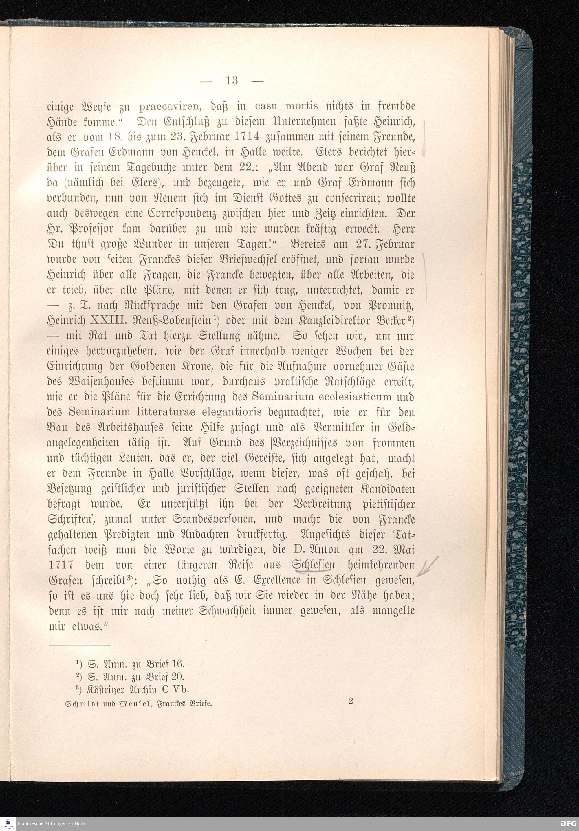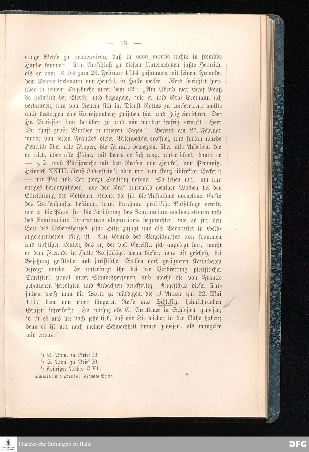 A.H.Franckes Briefe an den Grafen Heinrich XXIV. j.L. Reuß zu Köstritz und seine Gemahlin Eleonore aus den Jahren 1704 bis 1727 als Beitrag zur Geschichte des Pietismus herausgegeben von Dr.Berthold Schmidt Fürstl.Reuß j.L.Archivrat und Lic.theol. Otto Meusel Gymnasialoberlehrer in Schleiz. Leipzig, Verlag der Dürr'schen Buchhandlung 1905.