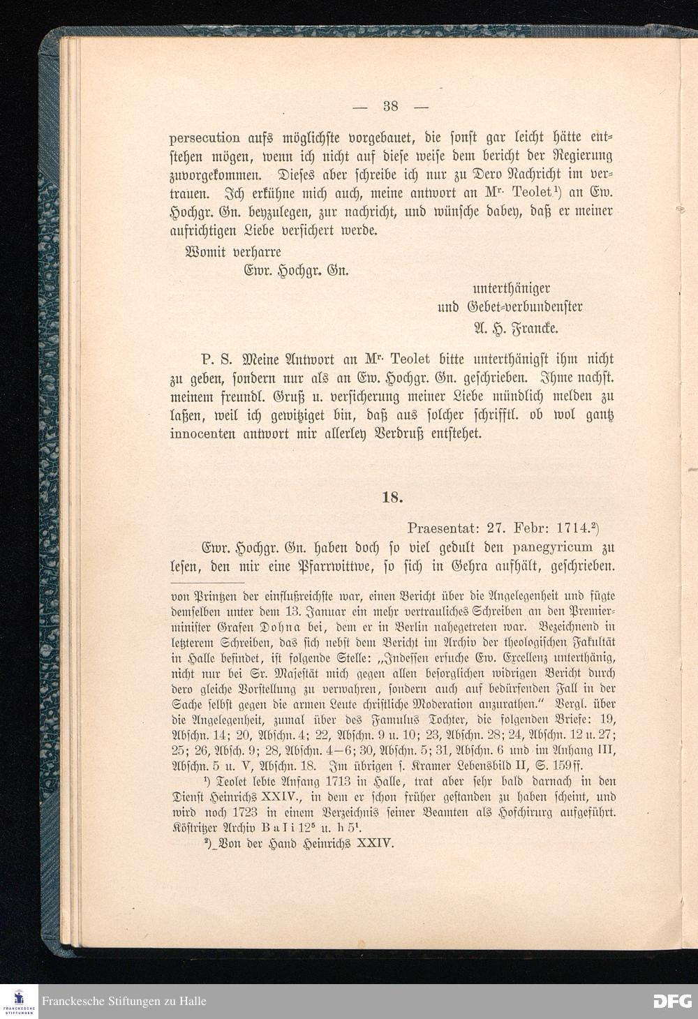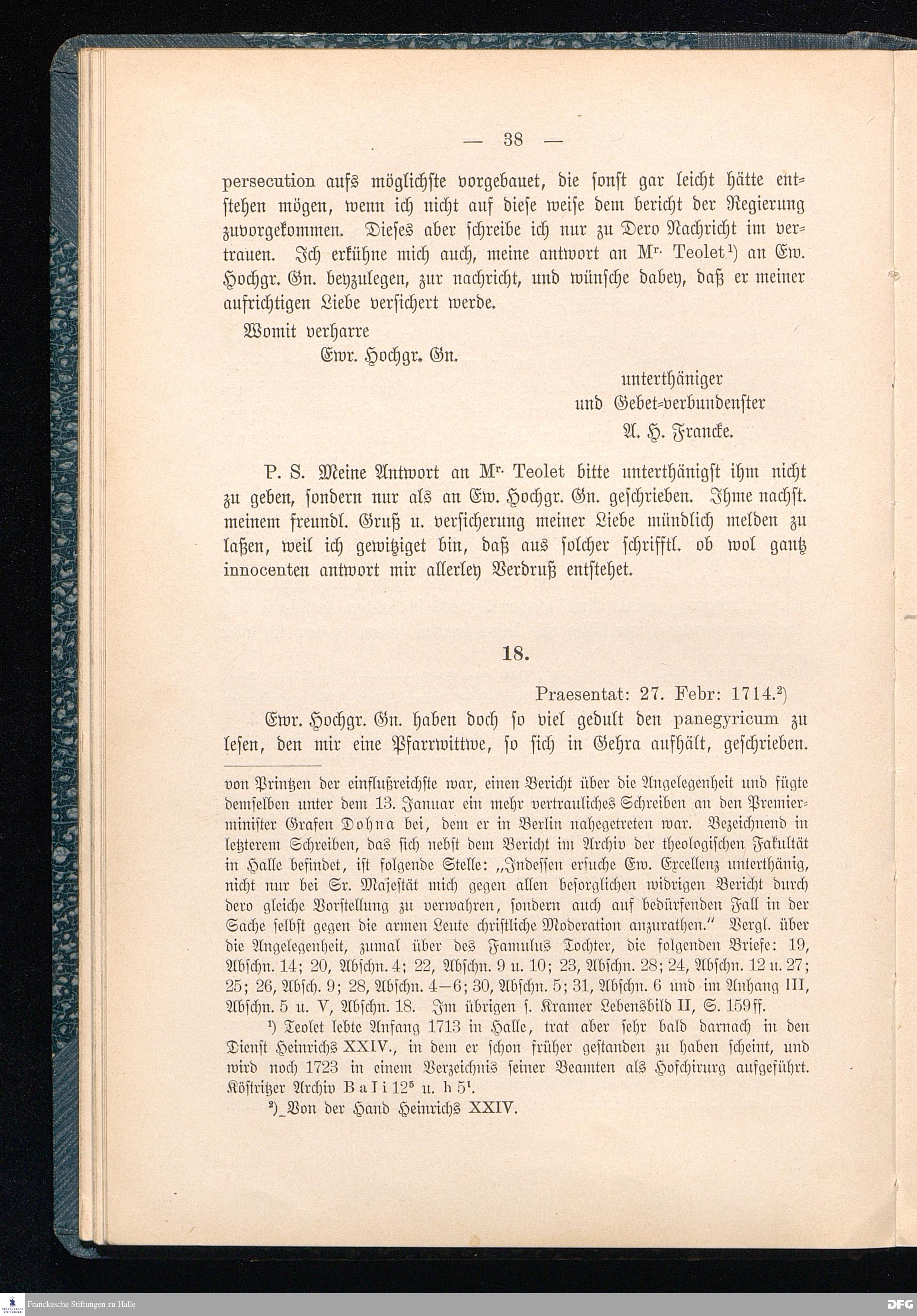 A.H.Franckes Briefe an den Grafen Heinrich XXIV. j.L. Reuß zu Köstritz und seine Gemahlin Eleonore aus den Jahren 1704 bis 1727 als Beitrag zur Geschichte des Pietismus herausgegeben von Dr.Berthold Schmidt Fürstl.Reuß j.L.Archivrat und Lic.theol. Otto Meusel Gymnasialoberlehrer in Schleiz. Leipzig, Verlag der Dürr'schen Buchhandlung 1905.