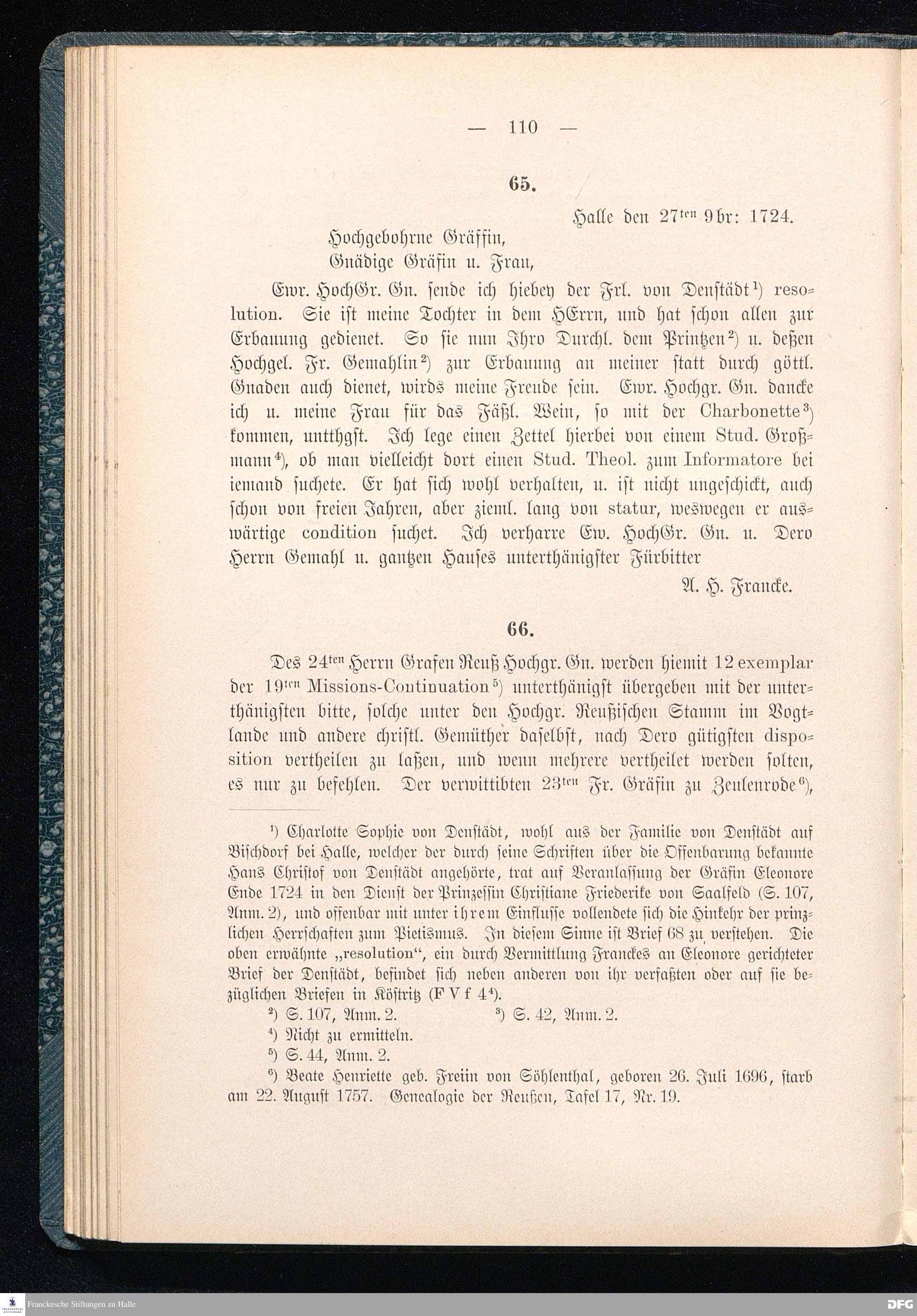 A.H.Franckes Briefe an den Grafen Heinrich XXIV. j.L. Reuß zu Köstritz und seine Gemahlin Eleonore aus den Jahren 1704 bis 1727 als Beitrag zur Geschichte des Pietismus herausgegeben von Dr.Berthold Schmidt Fürstl.Reuß j.L.Archivrat und Lic.theol. Otto Meusel Gymnasialoberlehrer in Schleiz. Leipzig, Verlag der Dürr'schen Buchhandlung 1905.