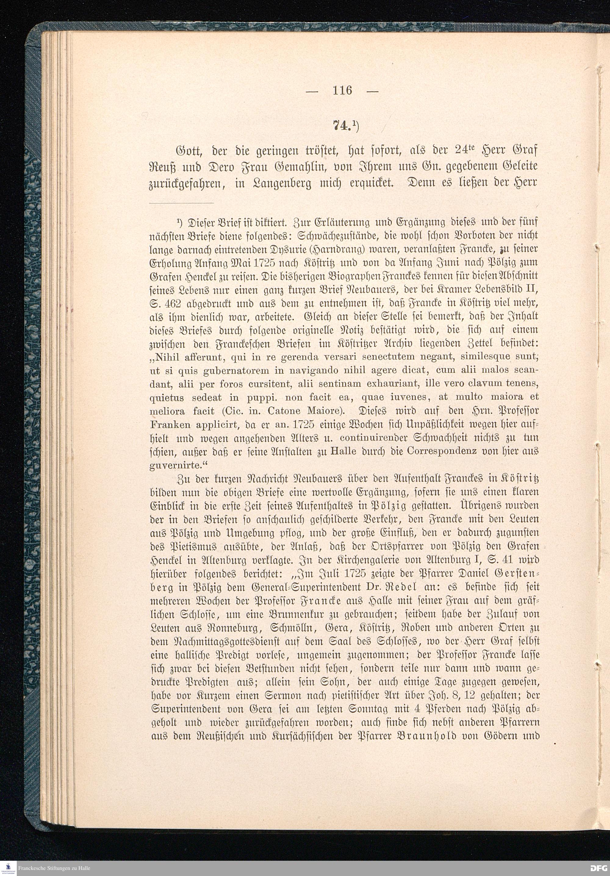 A.H.Franckes Briefe an den Grafen Heinrich XXIV. j.L. Reuß zu Köstritz und seine Gemahlin Eleonore aus den Jahren 1704 bis 1727 als Beitrag zur Geschichte des Pietismus herausgegeben von Dr.Berthold Schmidt Fürstl.Reuß j.L.Archivrat und Lic.theol. Otto Meusel Gymnasialoberlehrer in Schleiz. Leipzig, Verlag der Dürr'schen Buchhandlung 1905.