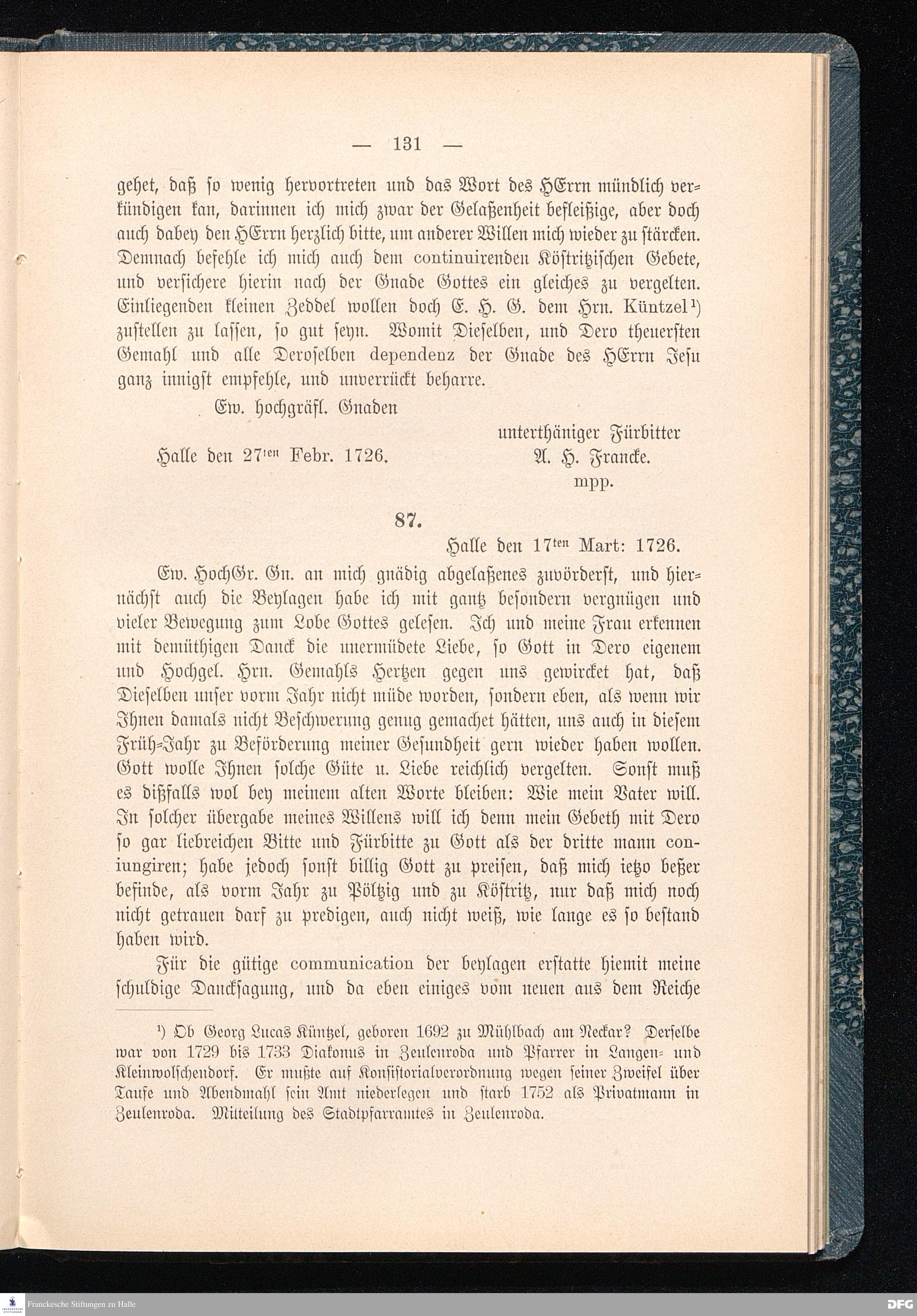A.H.Franckes Briefe an den Grafen Heinrich XXIV. j.L. Reuß zu Köstritz und seine Gemahlin Eleonore aus den Jahren 1704 bis 1727 als Beitrag zur Geschichte des Pietismus herausgegeben von Dr.Berthold Schmidt Fürstl.Reuß j.L.Archivrat und Lic.theol. Otto Meusel Gymnasialoberlehrer in Schleiz. Leipzig, Verlag der Dürr'schen Buchhandlung 1905.