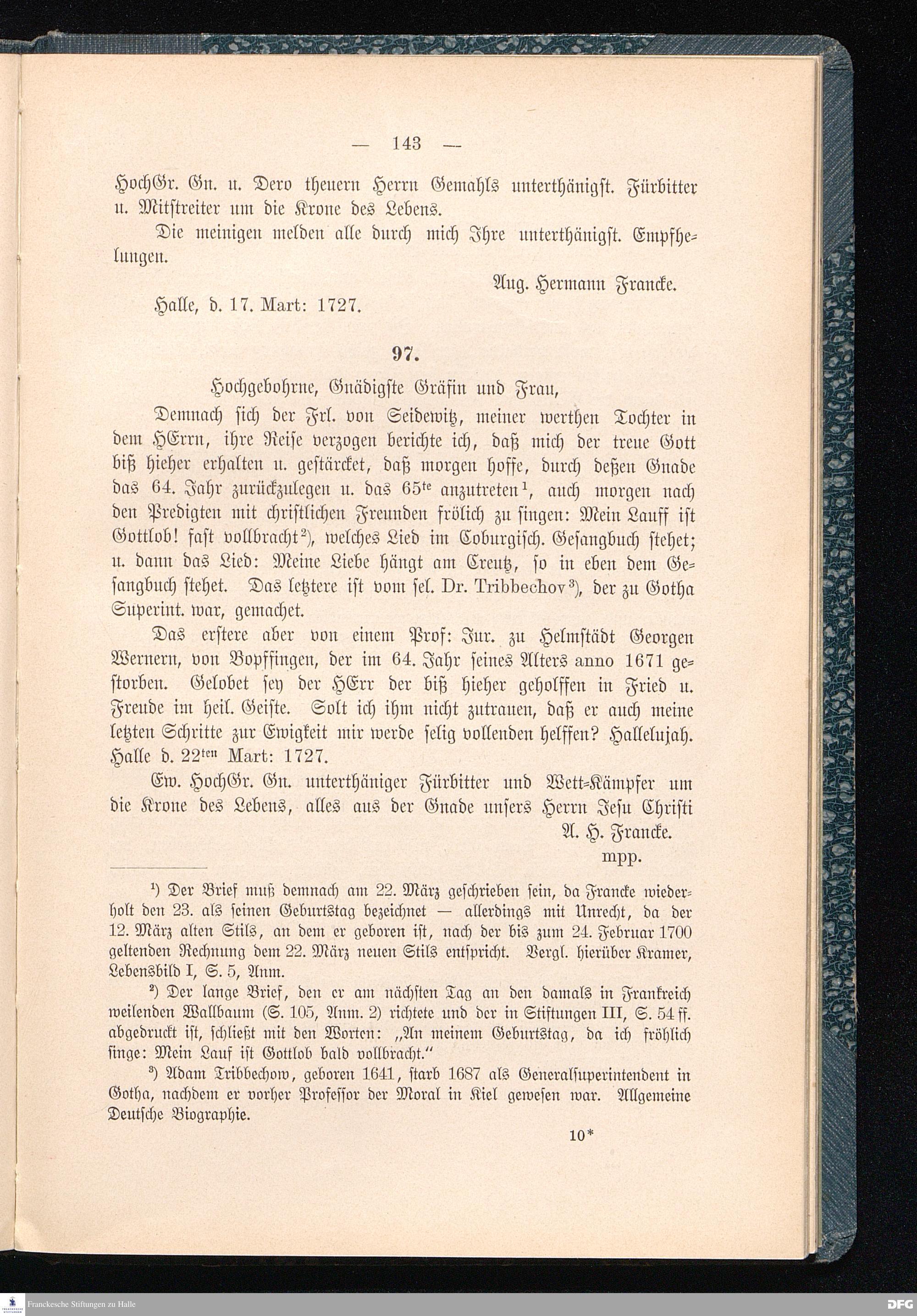 A.H.Franckes Briefe an den Grafen Heinrich XXIV. j.L. Reuß zu Köstritz und seine Gemahlin Eleonore aus den Jahren 1704 bis 1727 als Beitrag zur Geschichte des Pietismus herausgegeben von Dr.Berthold Schmidt Fürstl.Reuß j.L.Archivrat und Lic.theol. Otto Meusel Gymnasialoberlehrer in Schleiz. Leipzig, Verlag der Dürr'schen Buchhandlung 1905.