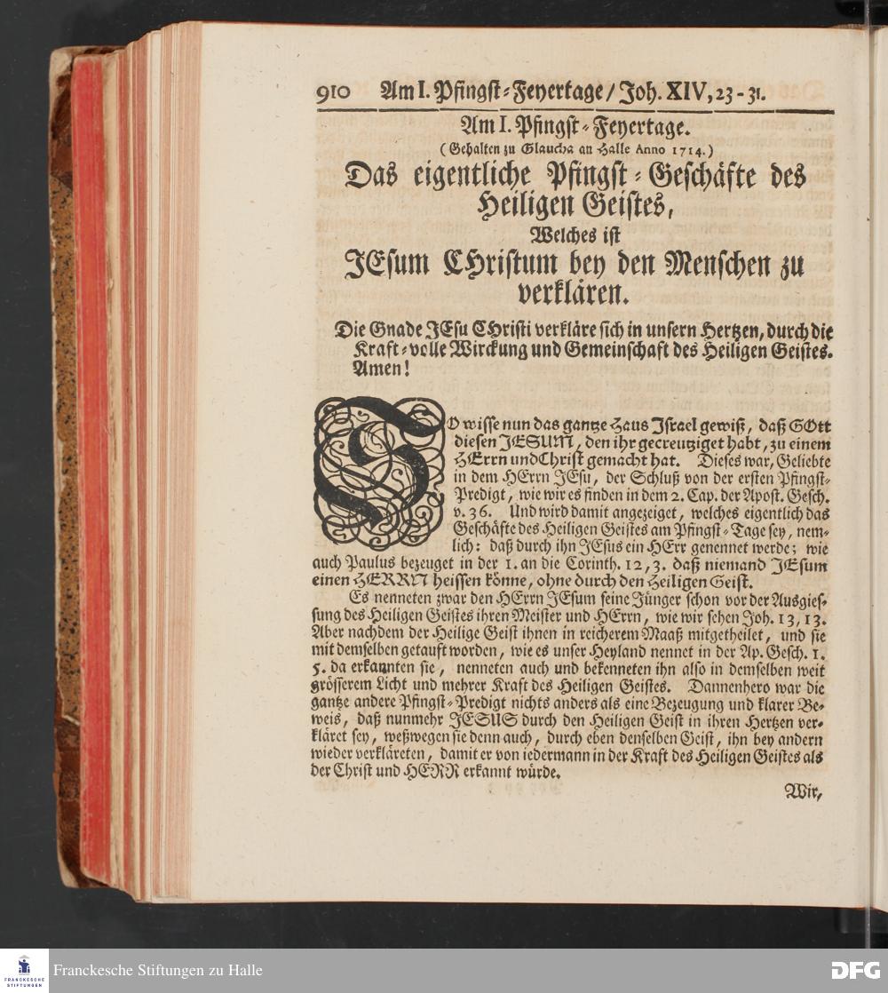 August Hermann Franckens, S.Theol.Prof.und Past. Sonn= und Fest=Tags=Predigten / Welche Theils in Halle, theils an verschiedenen auswärtigen Oertern, von wichtigen und auserlesenen Materien gehalten worden, Nebst Vorbereitung auf die hohen Feste und nützlichen Registern. Dritte Auflage. HALLE, gedruckt und verlegt im Wäysen=Hause MDCCXL. Mit Königl.Preuß.und Churfl.Brandenb.Privileg.