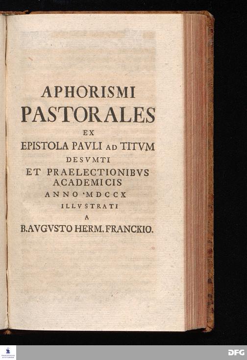 August Herr[!]mann Franckens, Weyl.S.Theol.Prof.Past.Vlric.et Schol. COLLEGIVM PASTORALE über D. IO. LVDOV. HARTMANNI PASTORALE EVANGELICVM. Anderer Theil; Nebst desselben Aus der Epistel an den Titum gezogenen und mit mehrerm erläuterten APHORISMIS PASTORALIBVS: herausgegeben von Gotthilf August Francken S.Theol.Doct.und Prof.Publ.Ord.der ersten Dioeces des Saal-Creyses Insp.und Pr.zur L.Fr. HALLE, In Verlegung des Wäysenhauses, 1743.