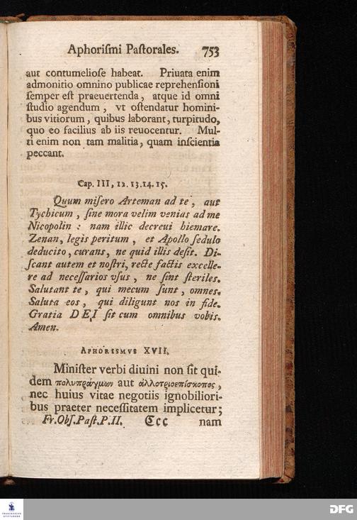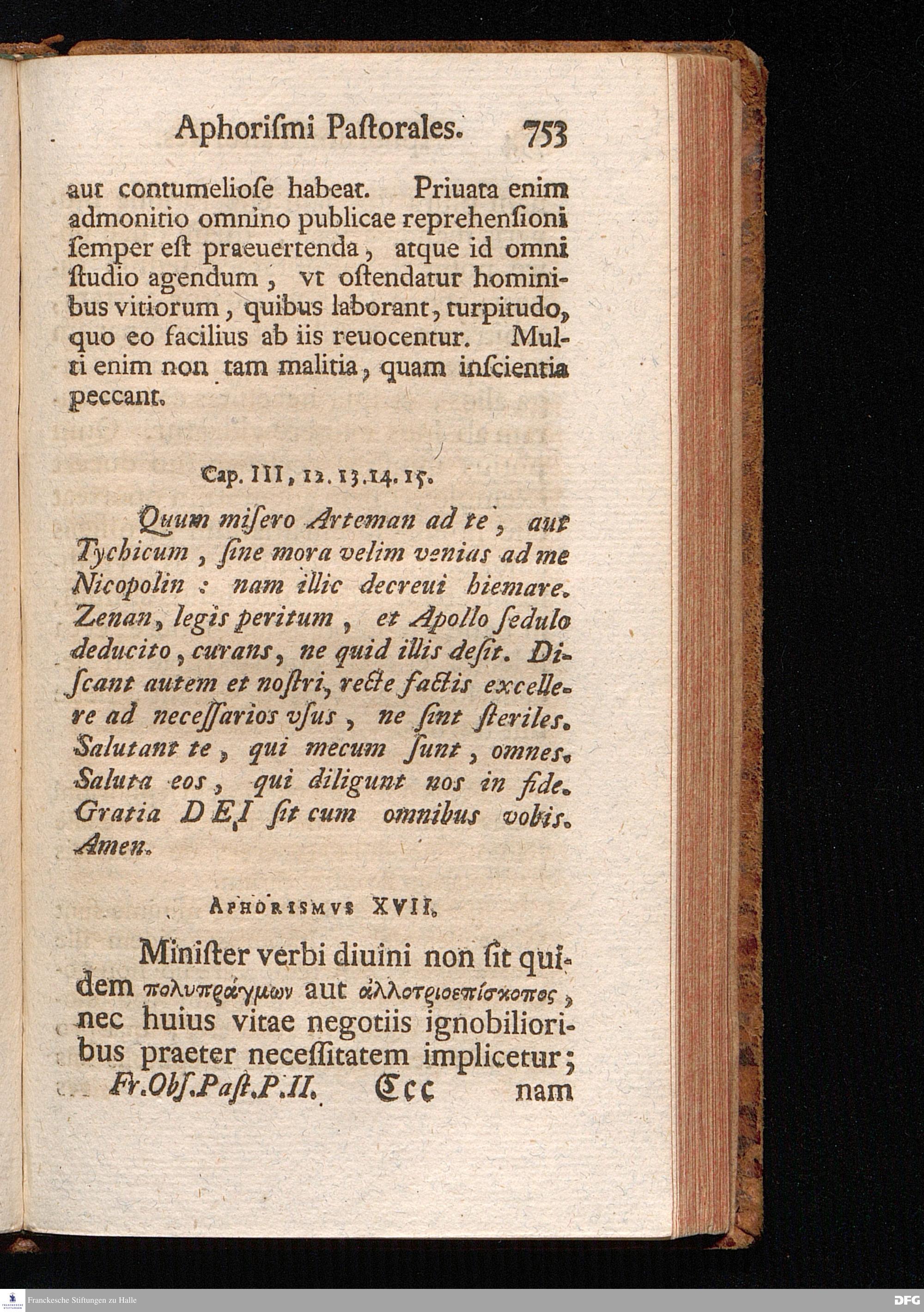 August Herr[!]mann Franckens, Weyl.S.Theol.Prof.Past.Vlric.et Schol. COLLEGIVM PASTORALE über D. IO. LVDOV. HARTMANNI PASTORALE EVANGELICVM. Anderer Theil; Nebst desselben Aus der Epistel an den Titum gezogenen und mit mehrerm erläuterten APHORISMIS PASTORALIBVS: herausgegeben von Gotthilf August Francken S.Theol.Doct.und Prof.Publ.Ord.der ersten Dioeces des Saal-Creyses Insp.und Pr.zur L.Fr. HALLE, In Verlegung des Wäysenhauses, 1743.