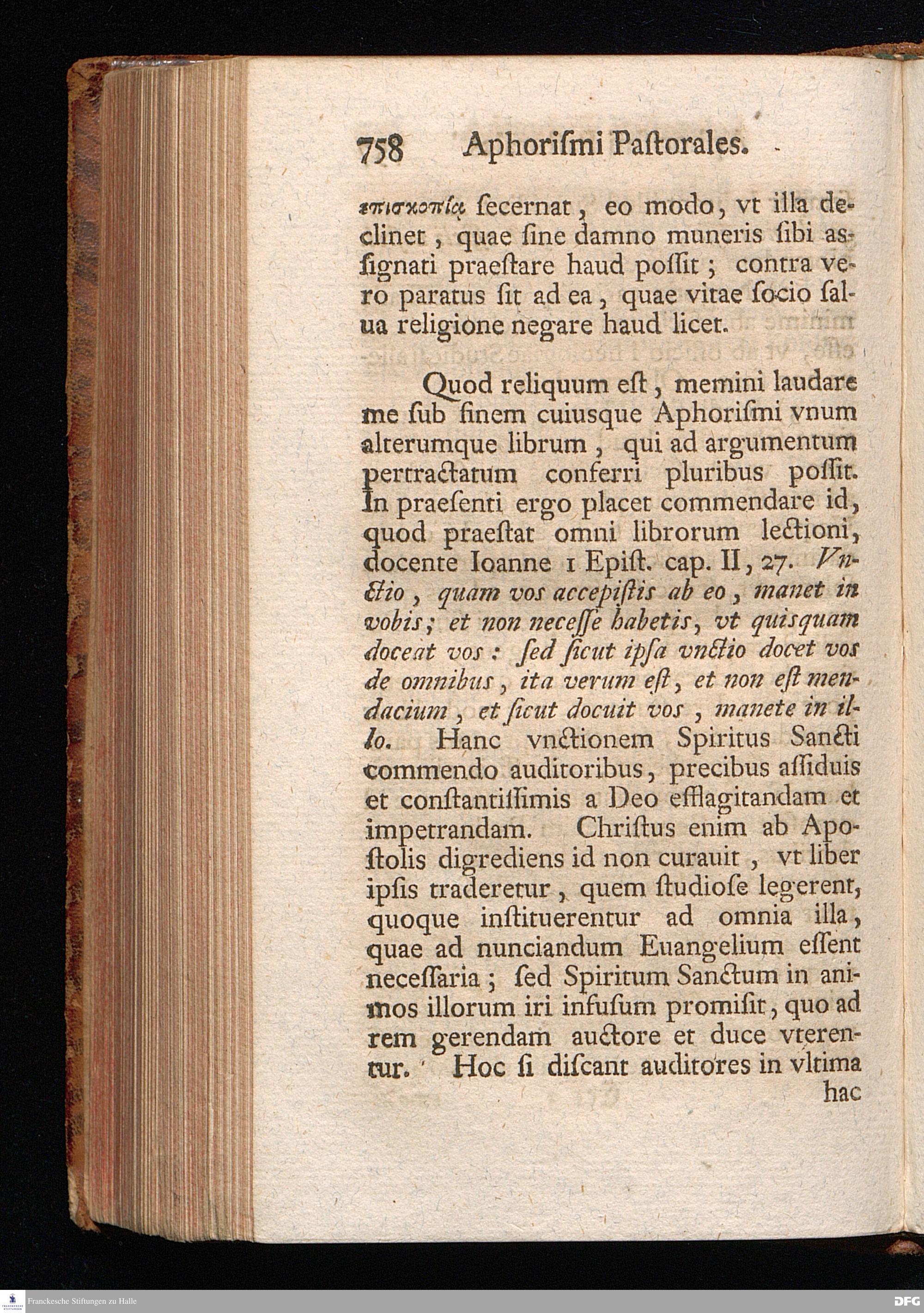 August Herr[!]mann Franckens, Weyl.S.Theol.Prof.Past.Vlric.et Schol. COLLEGIVM PASTORALE über D. IO. LVDOV. HARTMANNI PASTORALE EVANGELICVM. Anderer Theil; Nebst desselben Aus der Epistel an den Titum gezogenen und mit mehrerm erläuterten APHORISMIS PASTORALIBVS: herausgegeben von Gotthilf August Francken S.Theol.Doct.und Prof.Publ.Ord.der ersten Dioeces des Saal-Creyses Insp.und Pr.zur L.Fr. HALLE, In Verlegung des Wäysenhauses, 1743.