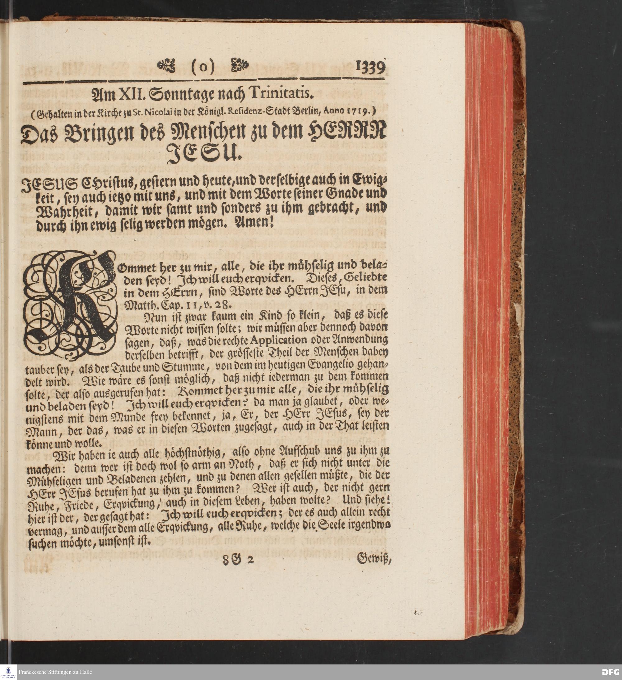 August Hermann Franckens, S.Theol.Prof.und Past. Sonn= und Fest=Tags=Predigten / Welche Theils in Halle, theils an verschiedenen auswärtigen Oertern, von wichtigen und auserlesenen Materien gehalten worden, Nebst Vorbereitung auf die hohen Feste und nützlichen Registern. Dritte Auflage. HALLE, gedruckt und verlegt im Wäysen=Hause MDCCXL. Mit Königl.Preuß.und Churfl.Brandenb.Privileg.