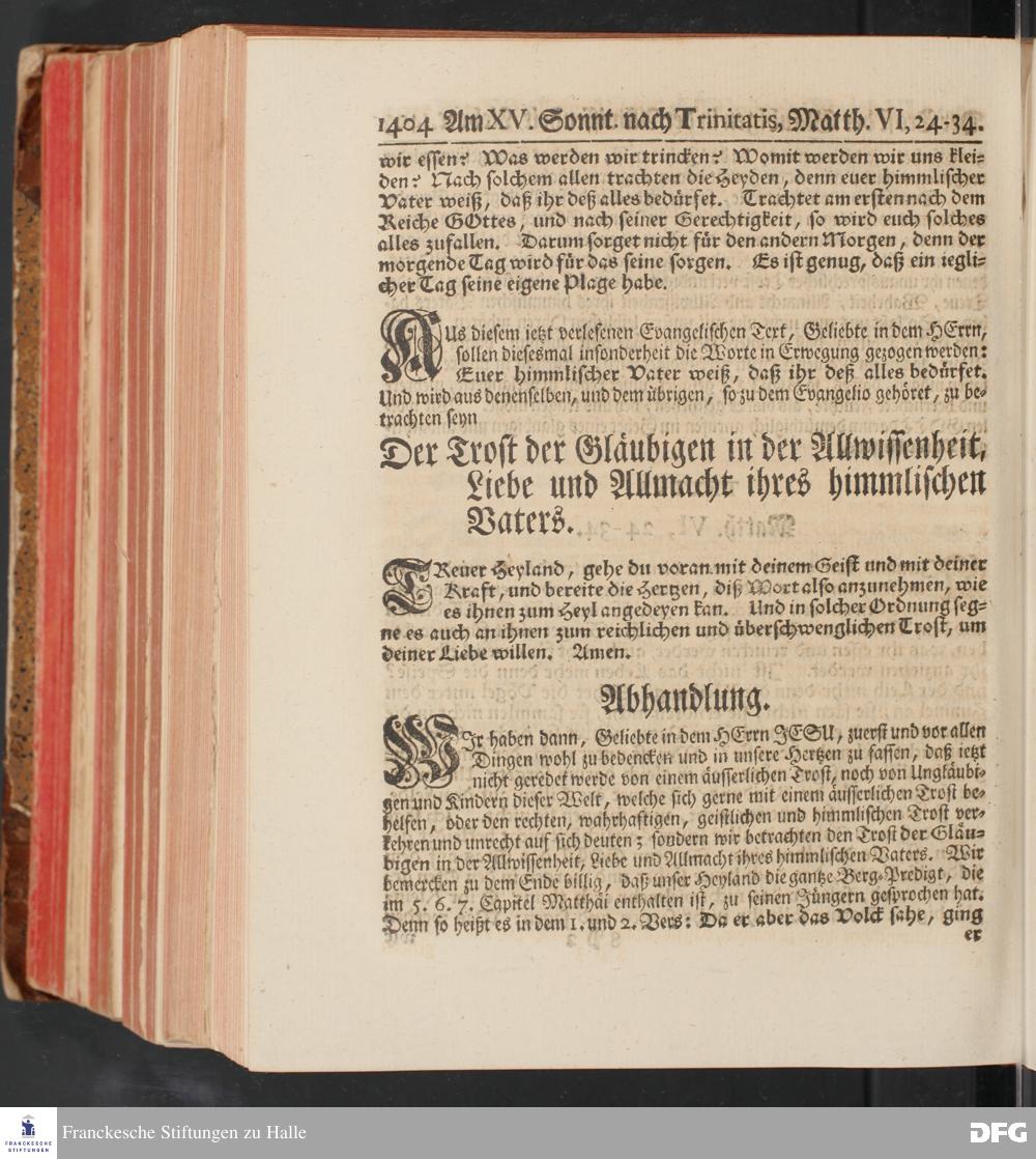 August Hermann Franckens, S.Theol.Prof.und Past. Sonn= und Fest=Tags=Predigten / Welche Theils in Halle, theils an verschiedenen auswärtigen Oertern, von wichtigen und auserlesenen Materien gehalten worden, Nebst Vorbereitung auf die hohen Feste und nützlichen Registern. Dritte Auflage. HALLE, gedruckt und verlegt im Wäysen=Hause MDCCXL. Mit Königl.Preuß.und Churfl.Brandenb.Privileg.
