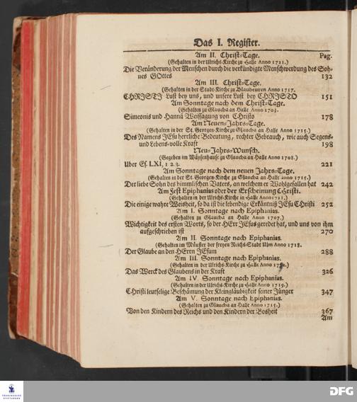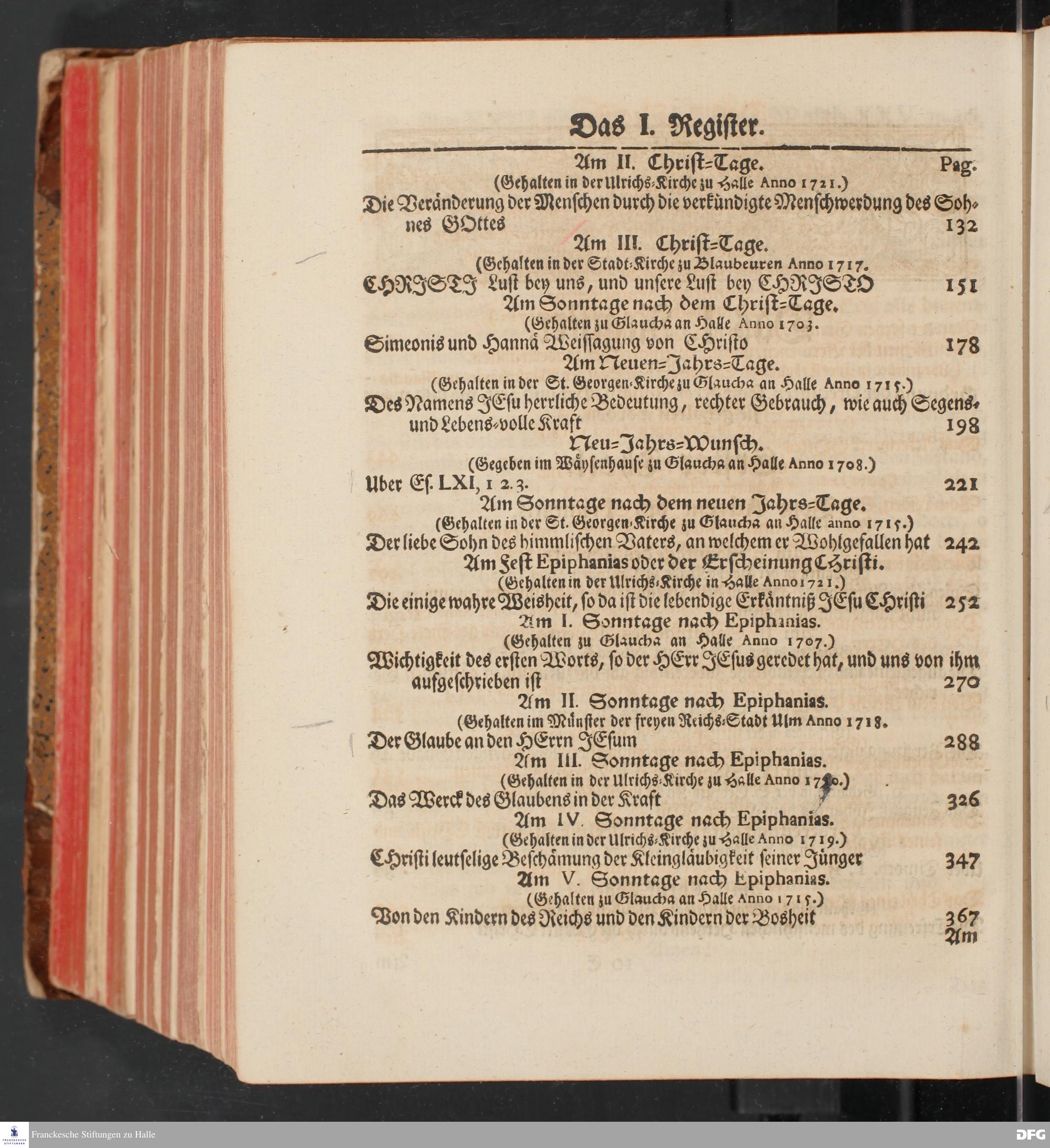 August Hermann Franckens, S.Theol.Prof.und Past. Sonn= und Fest=Tags=Predigten / Welche Theils in Halle, theils an verschiedenen auswärtigen Oertern, von wichtigen und auserlesenen Materien gehalten worden, Nebst Vorbereitung auf die hohen Feste und nützlichen Registern. Dritte Auflage. HALLE, gedruckt und verlegt im Wäysen=Hause MDCCXL. Mit Königl.Preuß.und Churfl.Brandenb.Privileg.