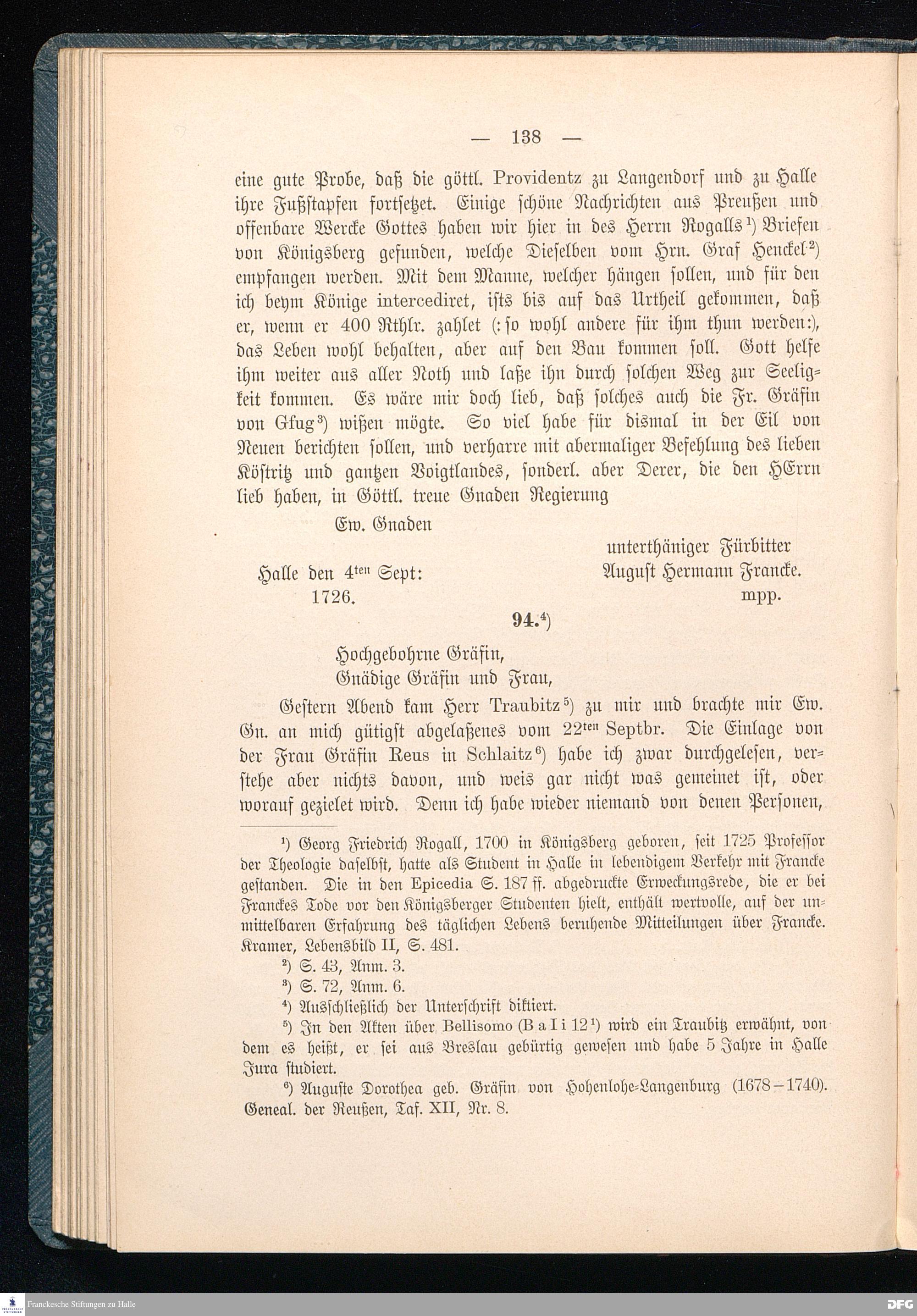 A.H.Franckes Briefe an den Grafen Heinrich XXIV. j.L. Reuß zu Köstritz und seine Gemahlin Eleonore aus den Jahren 1704 bis 1727 als Beitrag zur Geschichte des Pietismus herausgegeben von Dr.Berthold Schmidt Fürstl.Reuß j.L.Archivrat und Lic.theol. Otto Meusel Gymnasialoberlehrer in Schleiz. Leipzig, Verlag der Dürr'schen Buchhandlung 1905.
