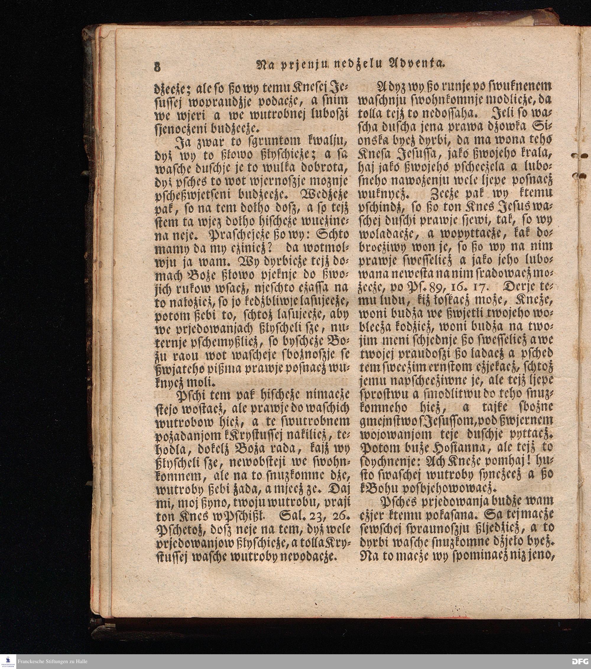 Prjedowanja na nedzelje a ßwjate dny, dzerzane a we njemskej reczi wohndate wot Knesa August Herrmann Franki [!] ßwojim czaßu Duchomneho w Hali na zyrkwi Ulricha, kotrez je do ßerskej reczje pschelozai Ernst Rychtar, Duchomny Roßaczizy, a czischczecz dal Jan Christian Samuel Pilz, Knihowwjasar Lubiju. w lieczi 1826.