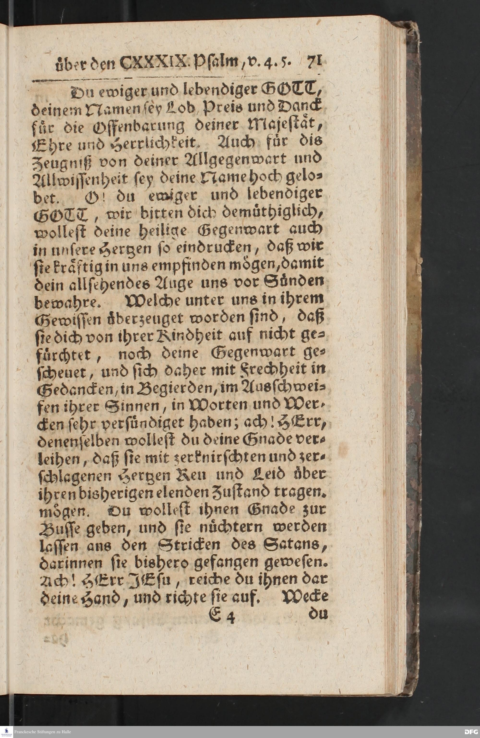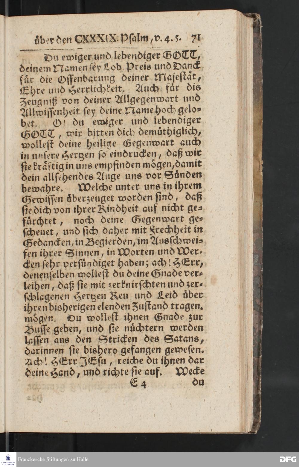 August Hermann Franckens, Weyl.Prof.Theol.Past.Ulr.und Schol. Erklärung Des hundert und neun und dreyßigsten Psalms / Auf Verlangen besonders herausgegeben Von Gotthilf August Francken, S.Theol.Prof.Ord.der ersten Dioeces des Saal=Creyses Insp.u.Pred.zur L.Fr. Andere Auflage. HALLE, In Verlegung des Wäysenhauses, 1739.